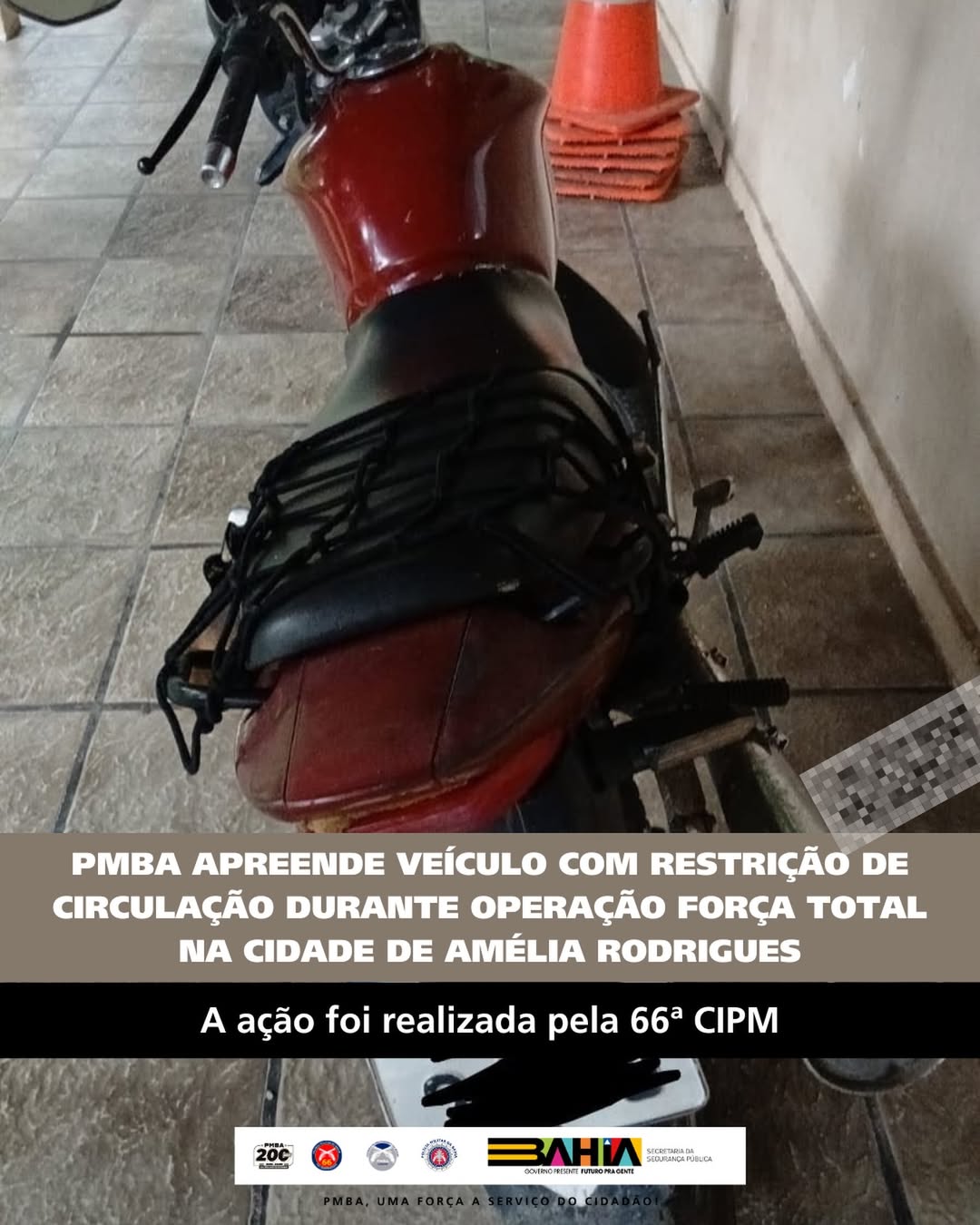Durante blitz realizada na manhã desta quinta-feira, 26 de fevereiro de 2026, no âmbito da Operação Força Total, em Amélia Rodrigues, policiais militares da 66ª CIPM apreenderam uma motocicleta com baixa definitiva (sucata), que circulava de forma irregular.