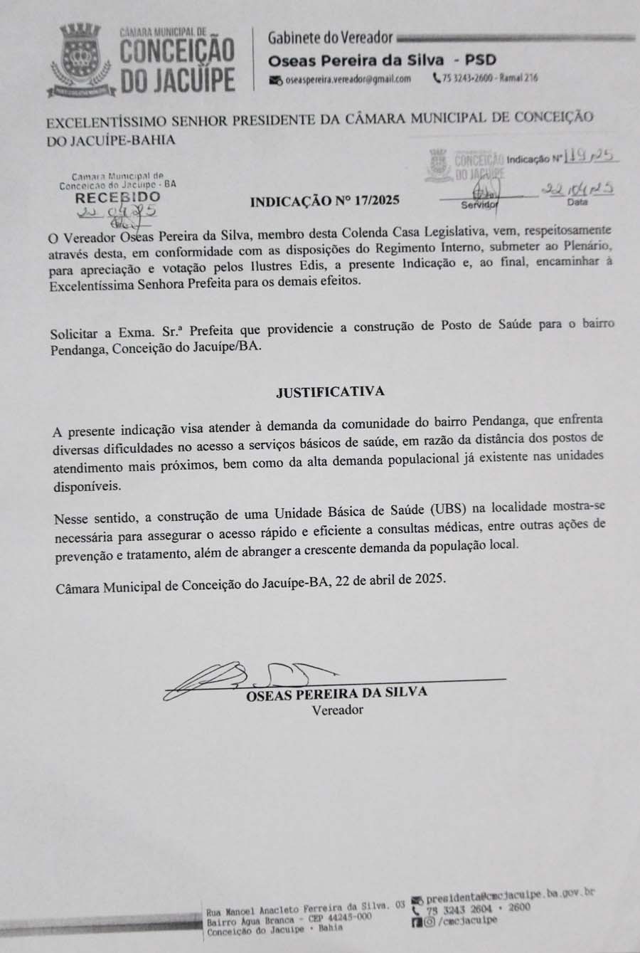 Na sessão da Câmara Municipal de Conceição do Jacuípe realizada nesta quarta-feira, 23 de abril de 2025, o vereador Oseas apresentou importantes solicitações e reflexões voltadas ao bem-estar da população.