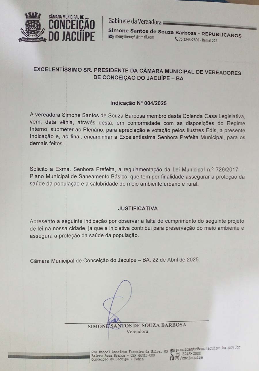 Na sessão da Câmara Municipal de Conceição do Jacuípe realizada nesta quarta-feira, 23 de abril de 2025, a vereadora Simone apresentou uma indicação solicitando que a Prefeitura coloque em prática o Plano Municipal de Saneamento Básico.