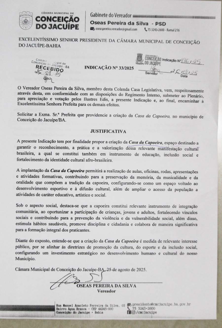 Na sessão da Câmara de Conceição do Jacuípe desta quarta-feira, 27 de agosto de 2025, o Vereador Oseas apresentou uma indicação solicitando a criação de uma Casa de Capoeira na cidade, com o objetivo de valorizar a cultura e oferecer espaço para práticas esportivas e educativas.