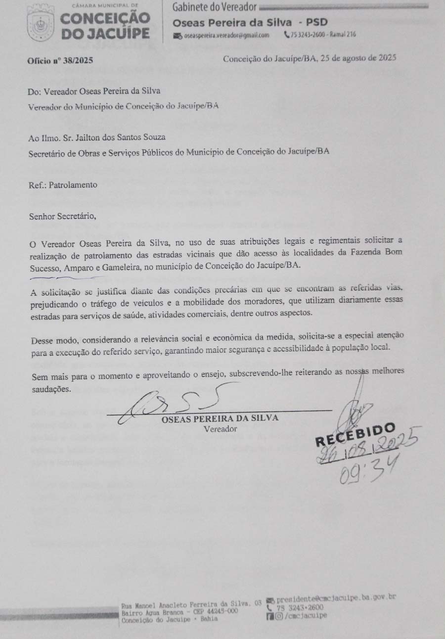Em seu discurso, Oseas também abordou diversos temas relevantes, como a questão das divisas de Conceição do Jacuípe, a necessidade de melhorias na nascente do Rio Jacuípe e outros assuntos de interesse da população.