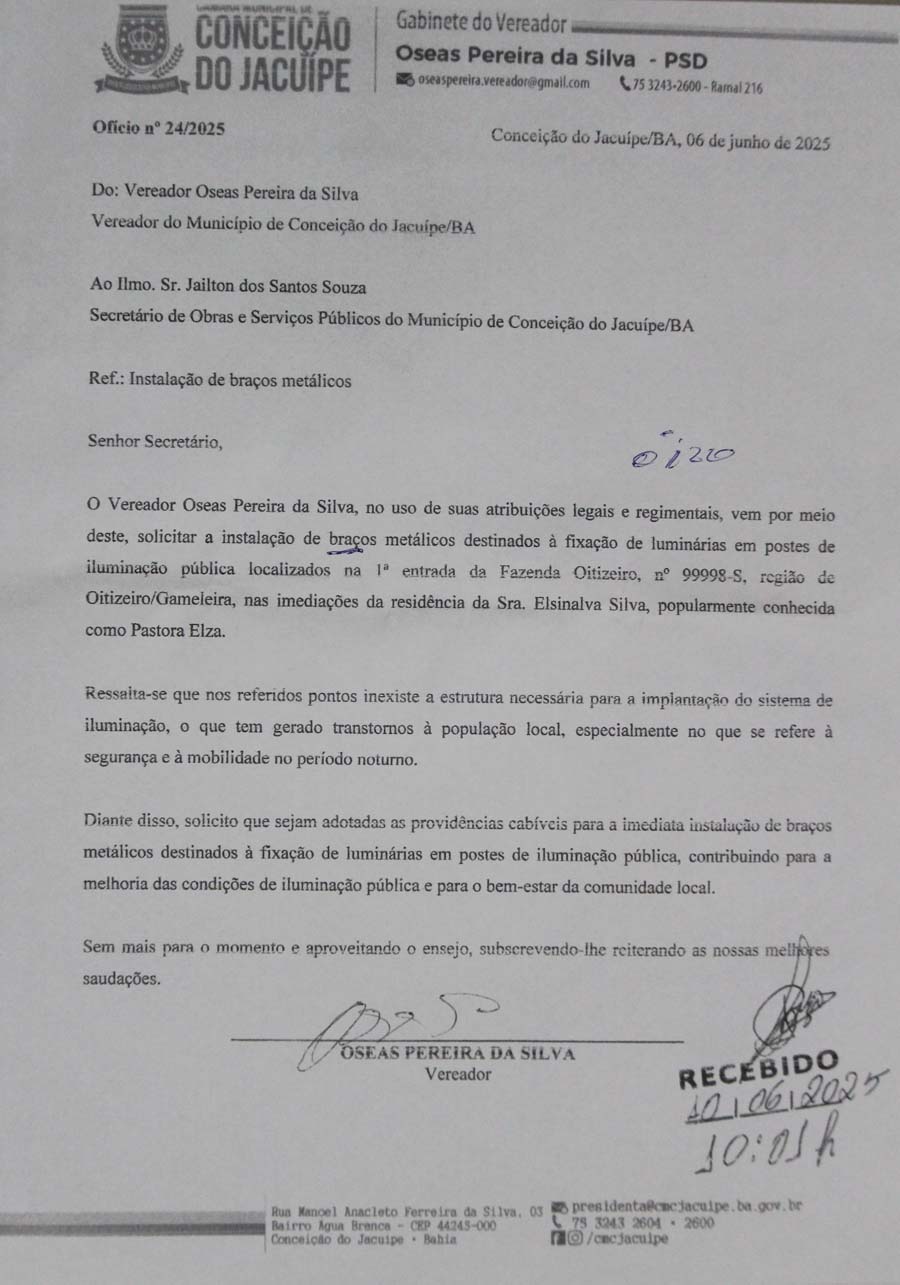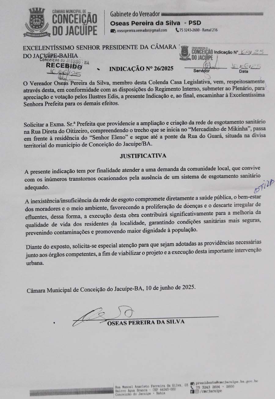 Na sessão da Câmara de Conceição do Jacuípe desta quarta-feira, 11 de junho de 2025, o Vereador Oseas apresentou uma importante indicação solicitando a colocação de manilhas no Oitizeiro, com o objetivo de ampliar o sistema de escoamento que segue até a Ponte do Guará.