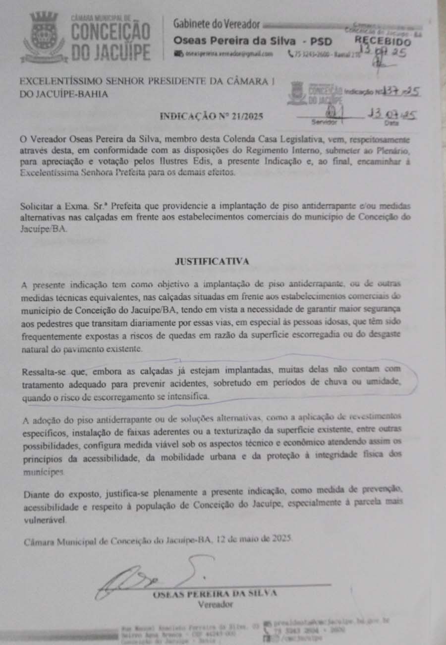 Entre as proposições, o vereador entrou com uma indicação solicitando a instalação de pisos antiderrapantes nas calçadas da cidade, visando mais segurança e acessibilidade para os pedestres, especialmente nos períodos chuvosos.