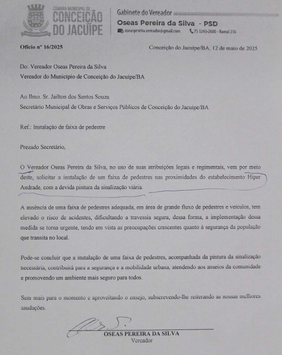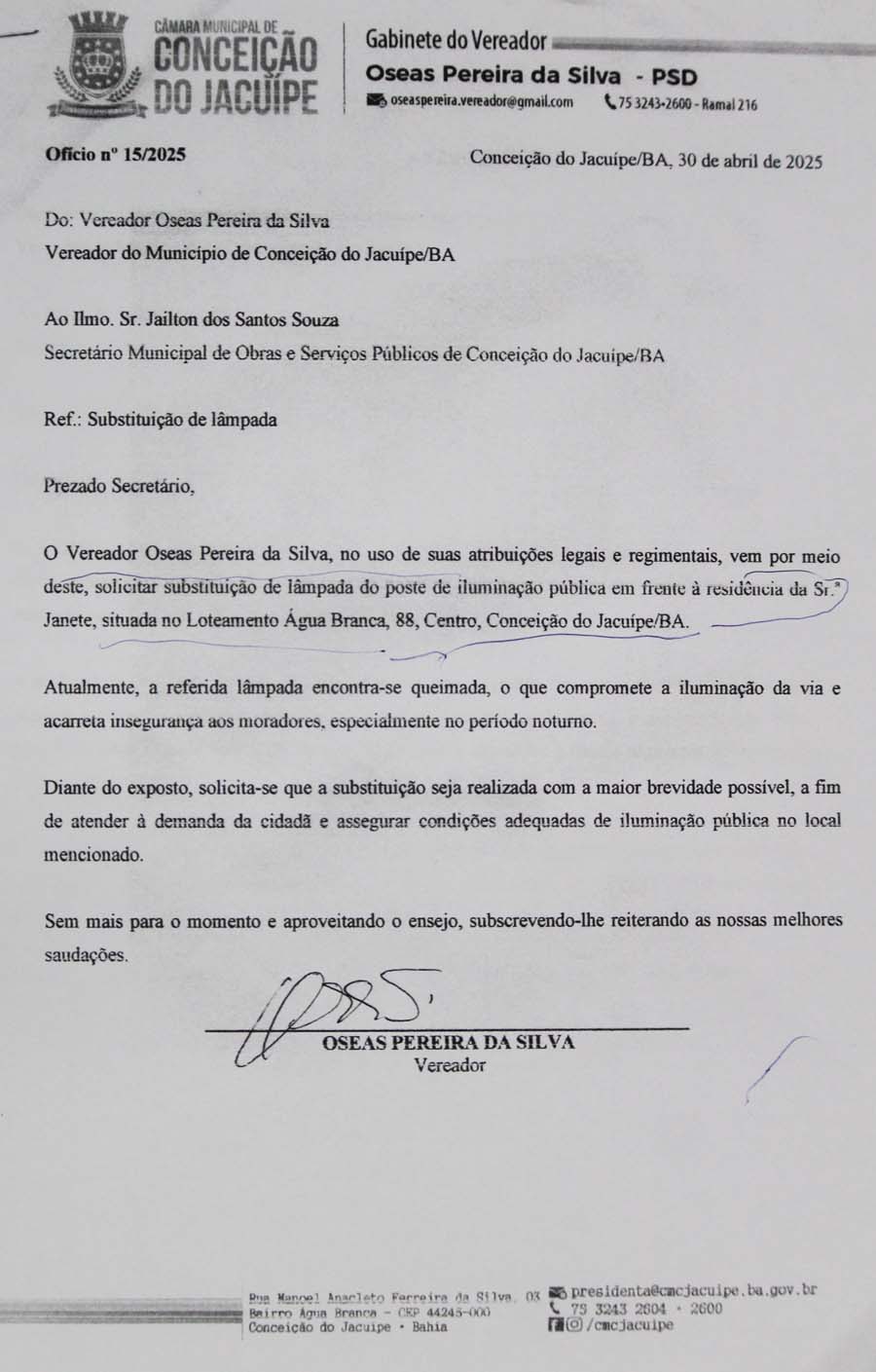 Além disso, Oseas também apresentou um ofício requerendo a colocação de lâmpadas em uma rua da cidade que se encontra às escuras, reforçando a importância da iluminação pública para a segurança e bem-estar dos moradores.