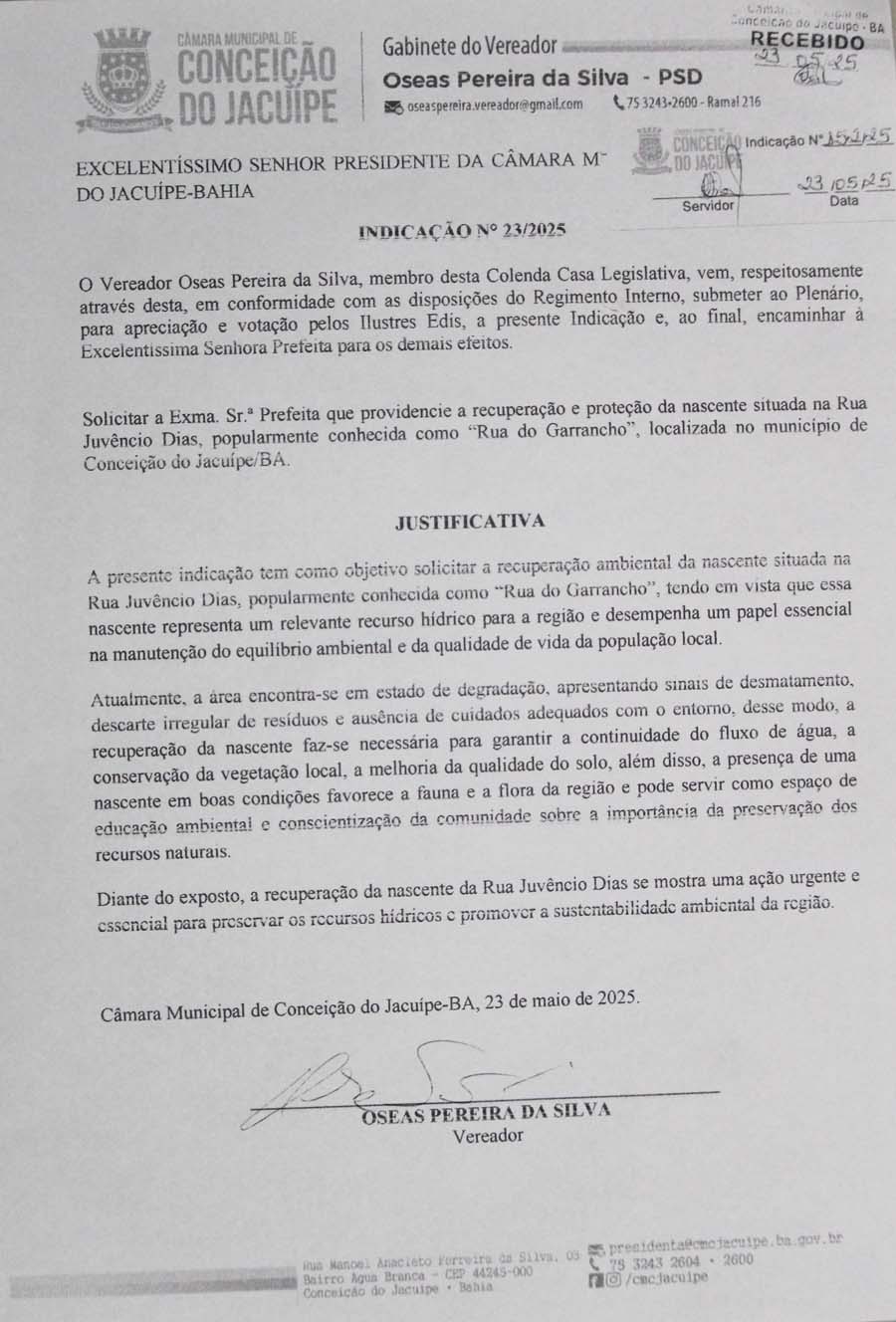 Na sessão da Câmara de Vereadores de Conceição do Jacuípe, realizada nesta quarta-feira, 28 de maio de 2025, o vereador Oséas apresentou uma importante indicação solicitando que a Prefeitura realize a manutenção e a preservação da nascente localizada na Rua Juvêncio Dias, conhecida como Rua do Garrancho.