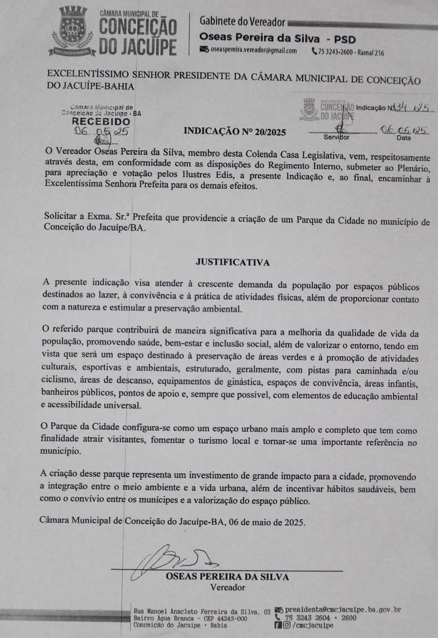 Na sessão da Câmara Municipal de Conceição do Jacuípe realizada nesta quarta-feira, 7 de maio de 2025, o vereador Oseas apresentou uma indicação solicitando a criação de um Parque Municipal na cidade.