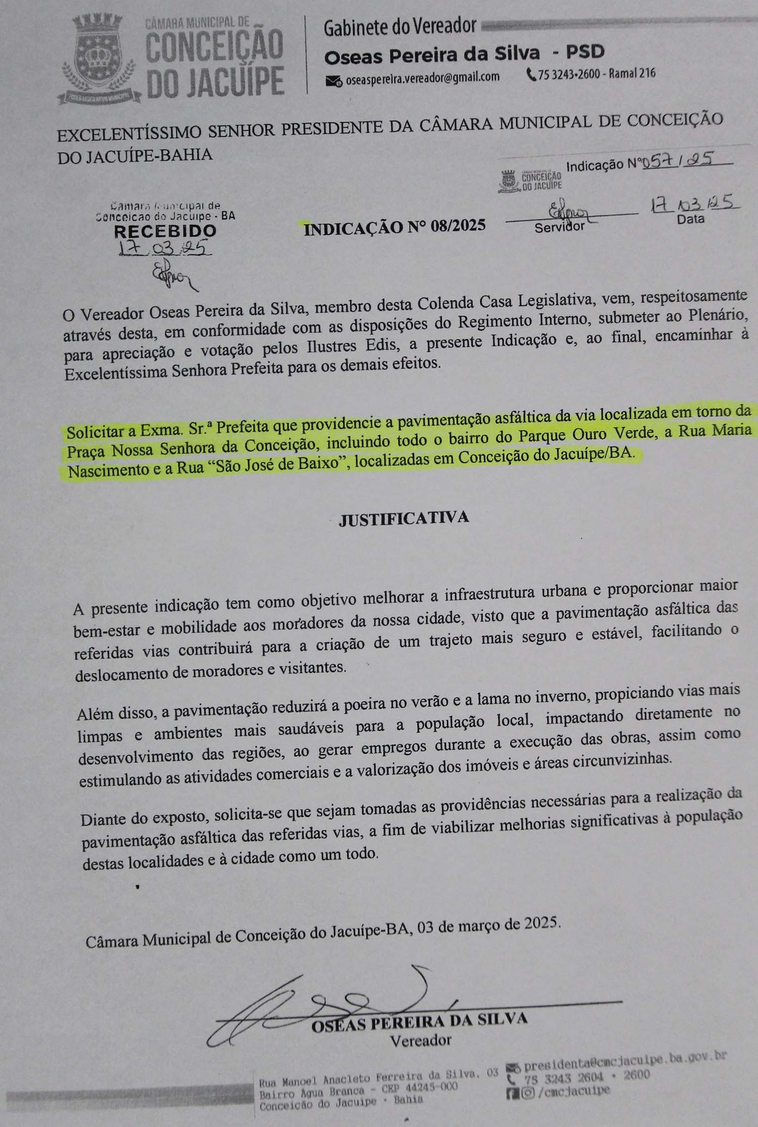 Na sessão da Câmara de Vereadores de Conceição do Jacuípe desta quarta-feira, 19 de março de 2025, o Vereador Oseas apresentou uma indicação solicitando a pavimentação asfáltica nos arredores da Praça Nossa Senhora da Conceição, incluindo o Parque Ouro Verde.