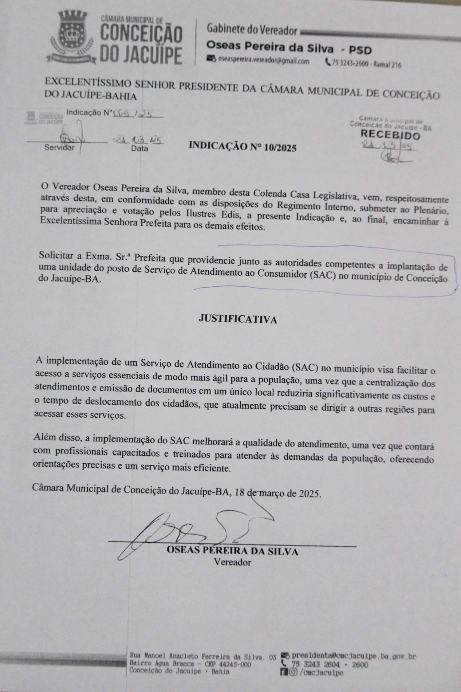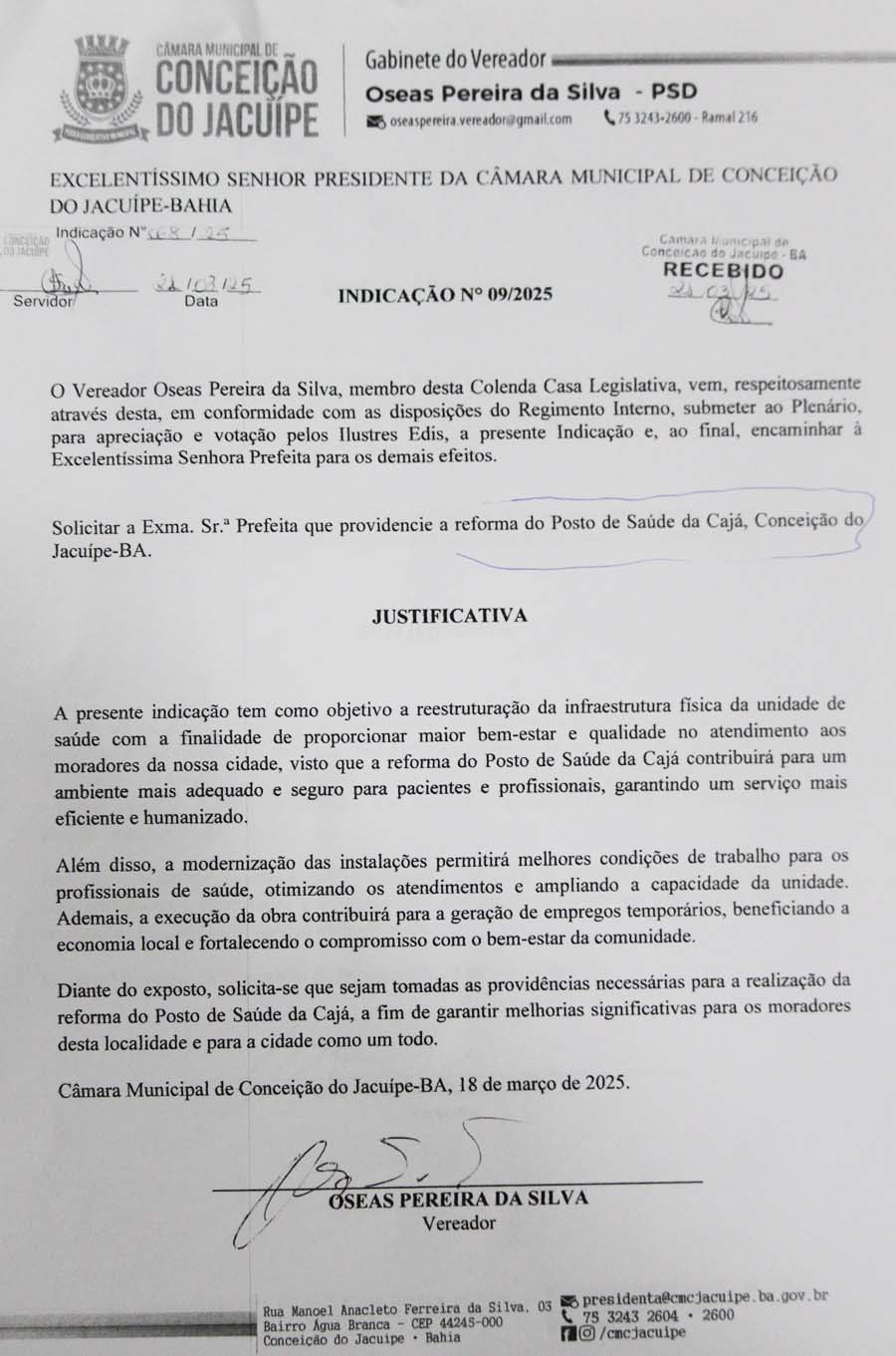 Na sessão da Câmara de Vereadores de Conceição do Jacuípe, realizada nesta quarta-feira, 26 de março de 2025, o vereador Oseas apresentou importantes solicitações para o município.