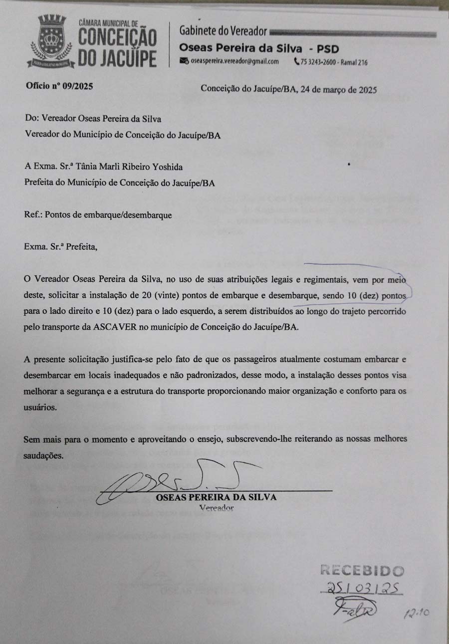 O vereador também solicitou o apoio da Polícia Militar de Conceição do Jacuípe para melhorar a organização do trânsito local, incluindo a definição e instalação de pontos de parada para as vans da ASCAVER, beneficiando motoristas e passageiros.