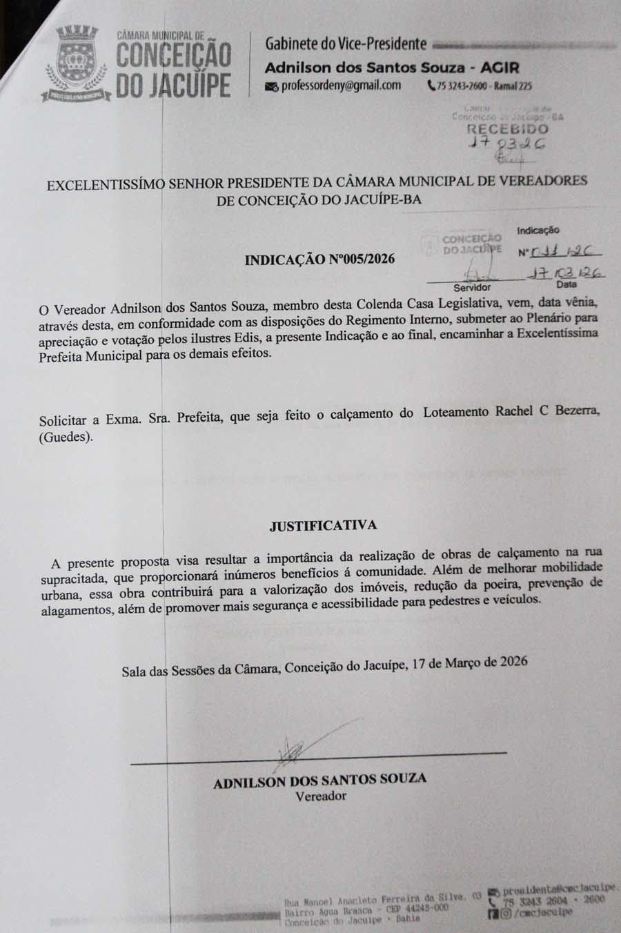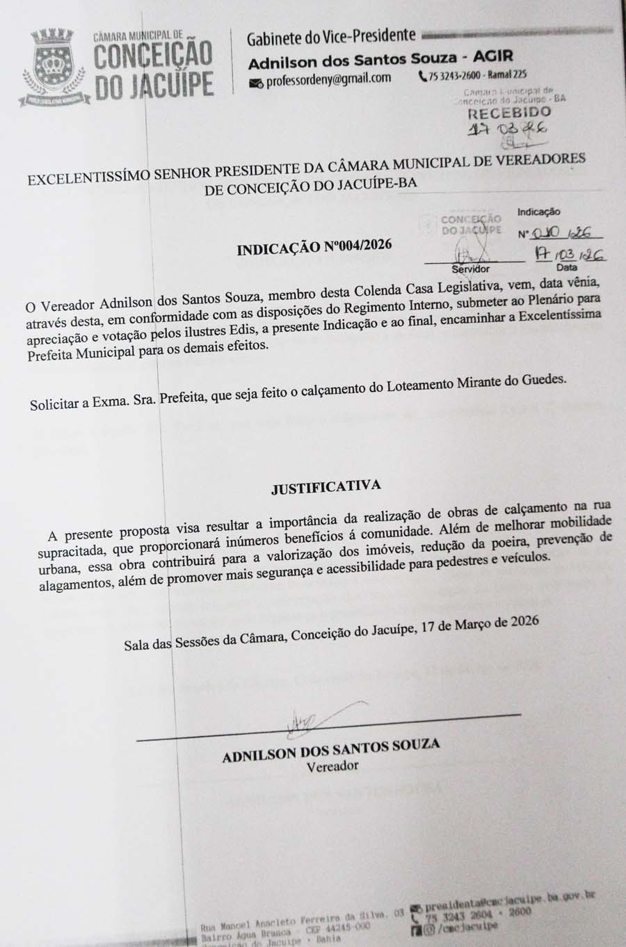 Na sessão da Câmara de Conceição do Jacuípe realizada nesta quarta-feira, 18 de março de 2026, o vereador Professor Deny apresentou duas indicações voltadas para melhorias de infraestrutura na zona urbana do município.
