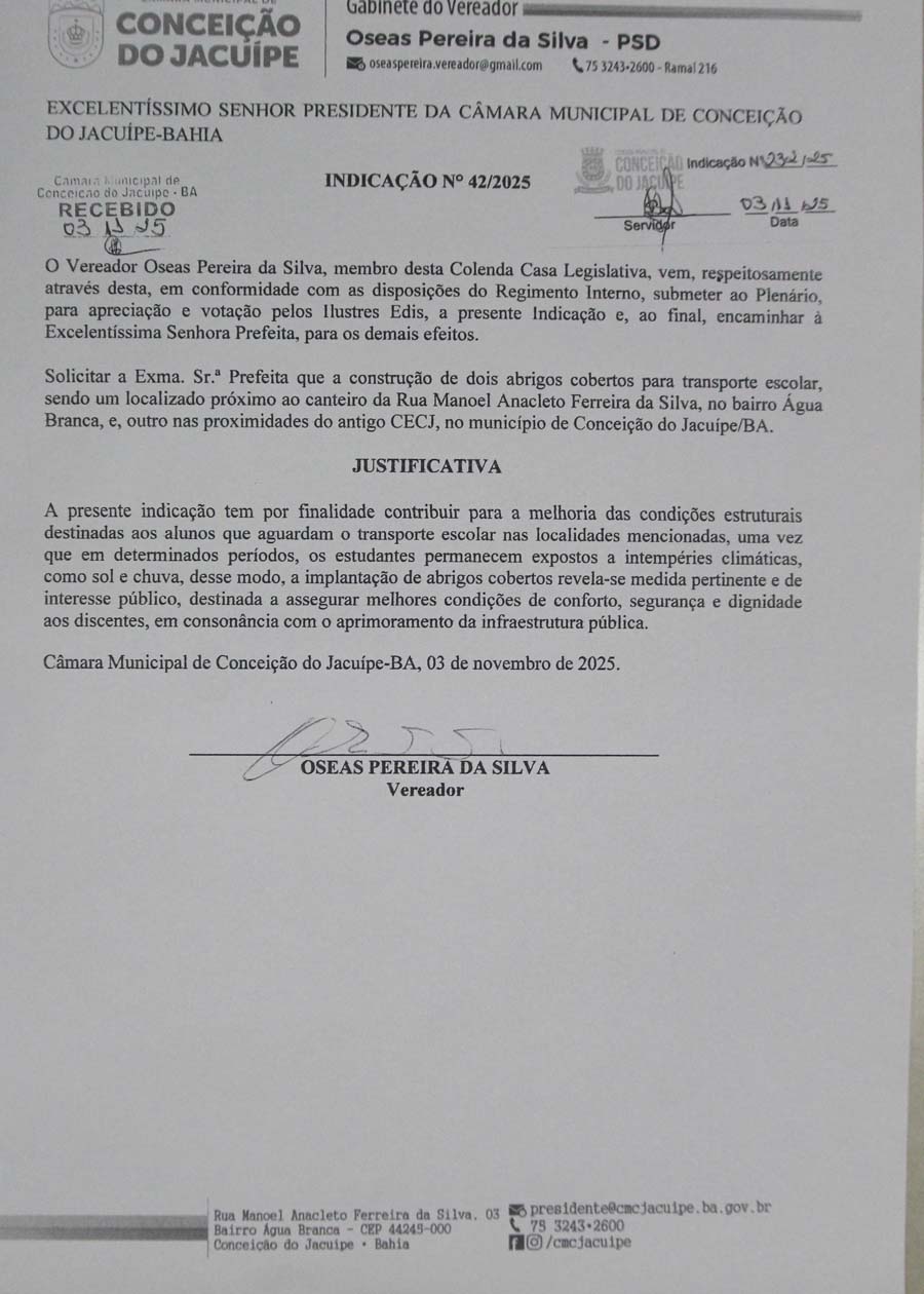 Na sessão da Câmara Municipal de Conceição do Jacuípe, realizada nesta quarta-feira, 05 de novembro de 2025, o vereador Oseas apresentou uma indicação solicitando a instalação de abrigos para os alunos das escolas que aguardam o transporte escolar.