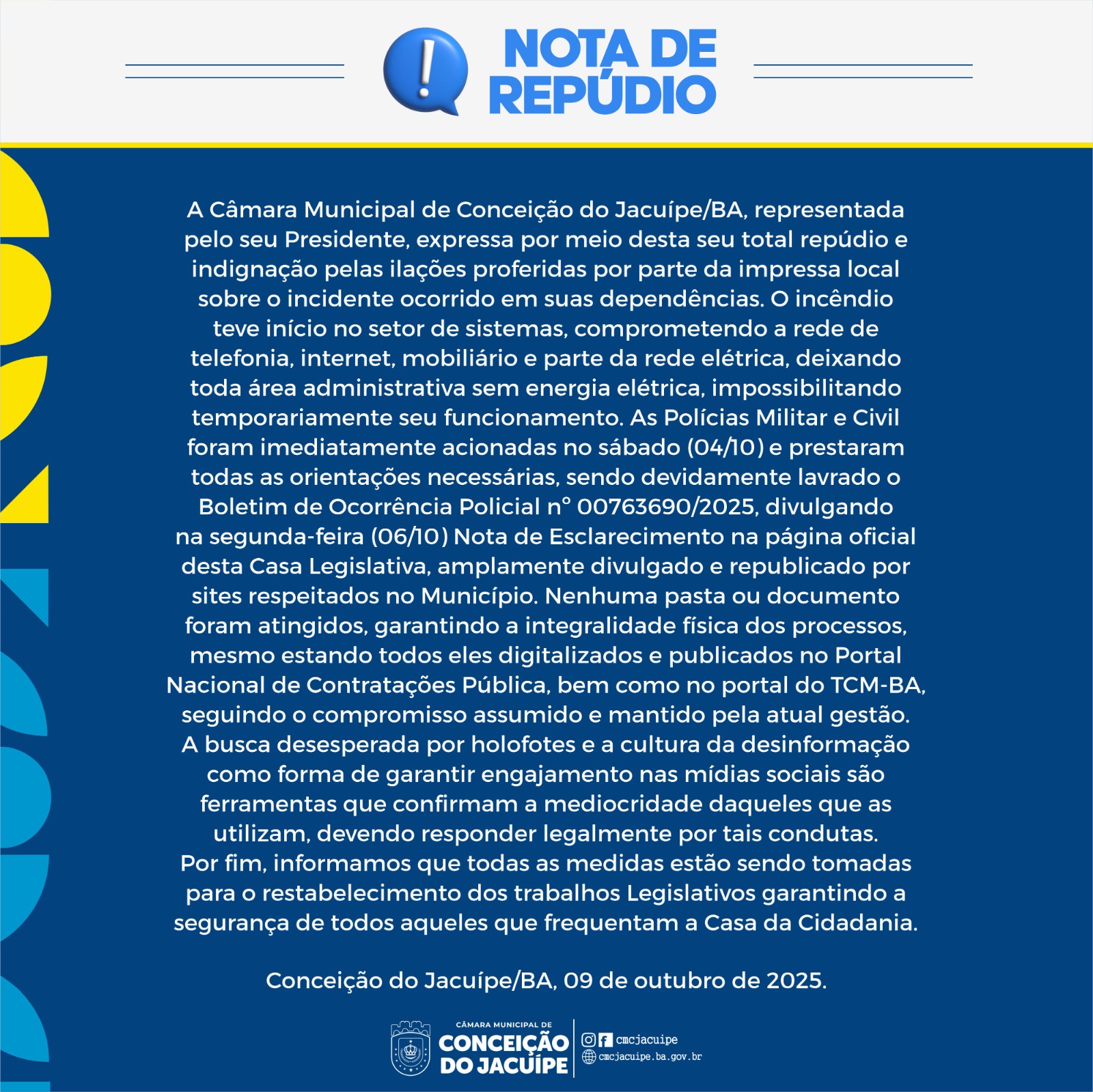 “A Câmara Municipal de Conceição do Jacuípe/BA, representada pelo seu Presidente, expressa por meio desta seu total repúdio e indignação pelas ilações proferidas por parte da impressa local sobre o incidente ocorrido em suas dependências.