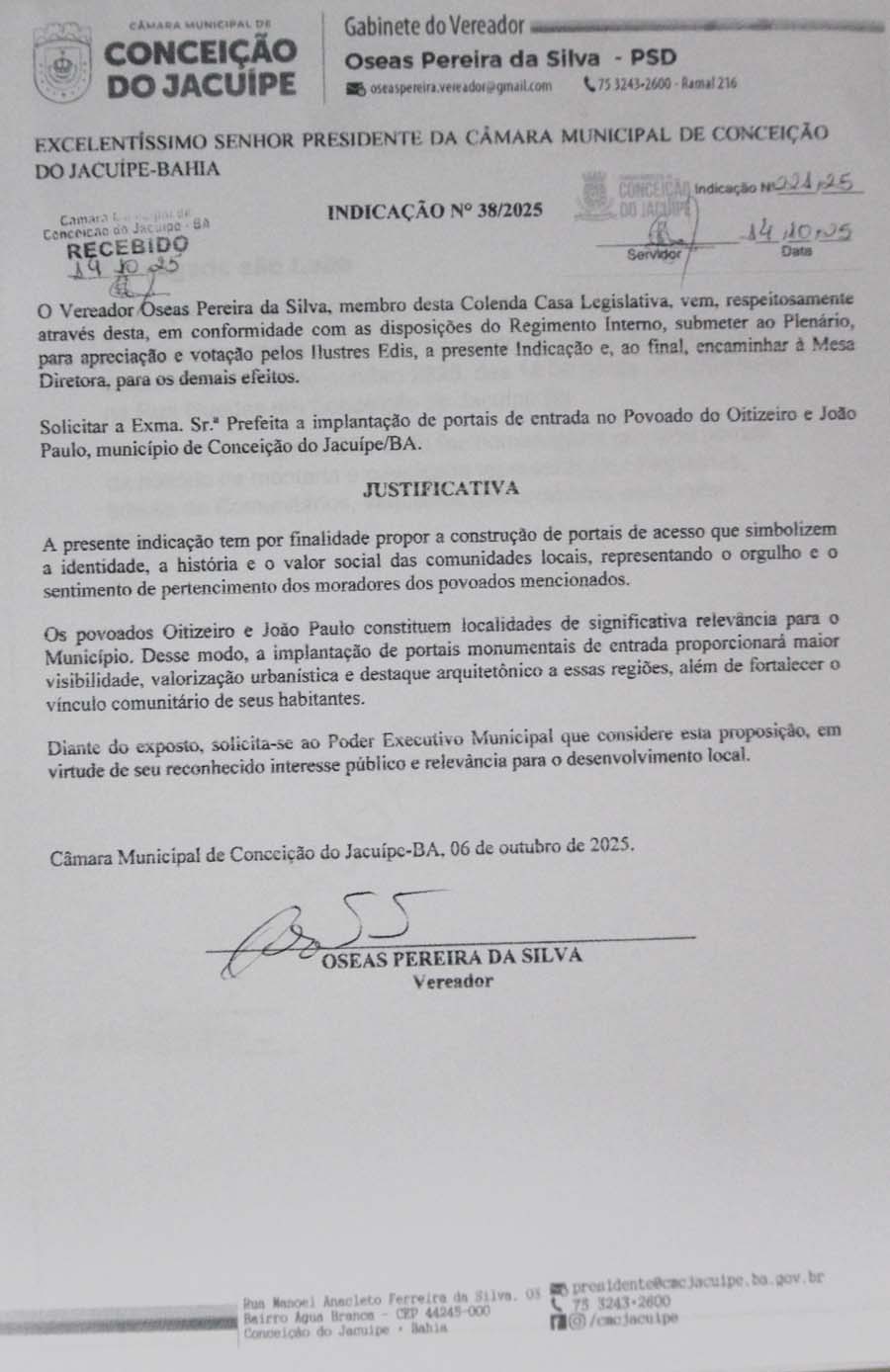 Na sessão da Câmara de Conceição do Jacuípe, realizada nesta quarta-feira, 15 de outubro de 2025, o Vereador Oseas apresentou uma indicação solicitando a criação de portais de entrada nos bairros Oitizeiro e João Paulo, com o objetivo de valorizar e embelezar vias de acesso do município.