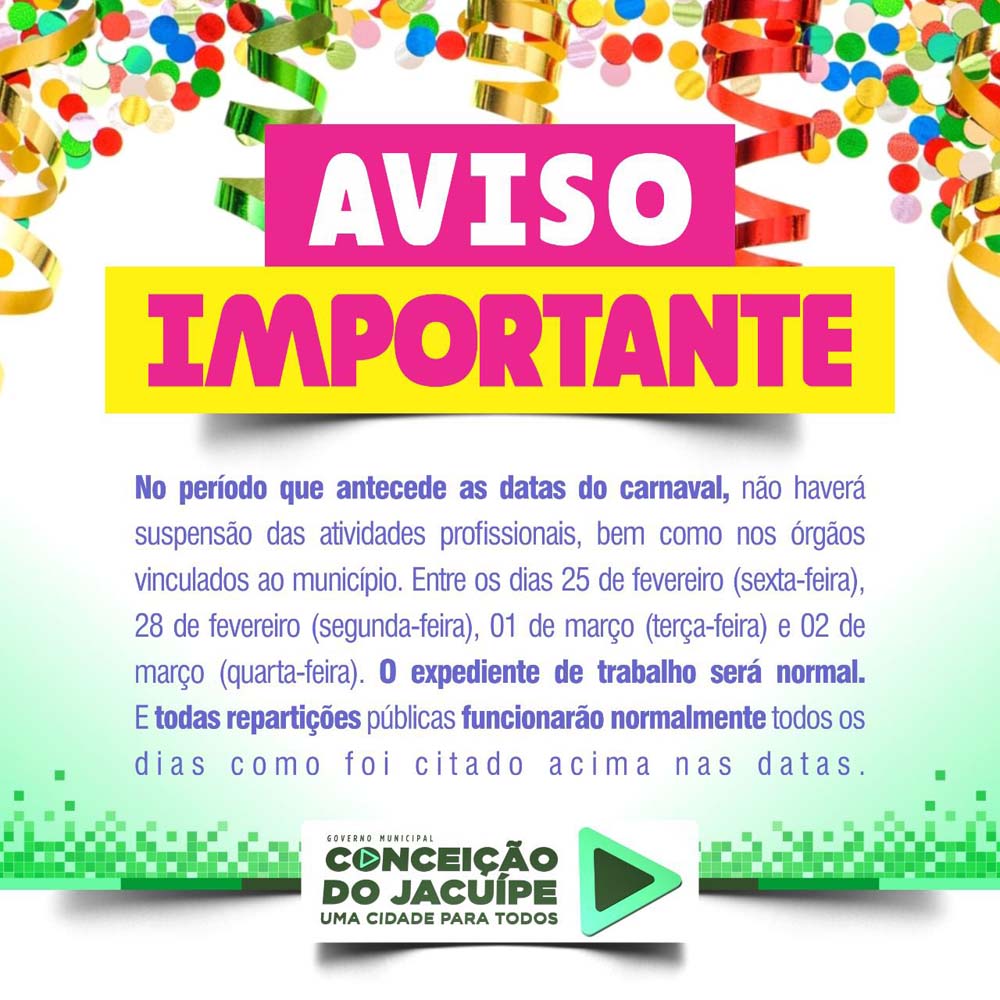 Prefeitura cancela pontos facultativos de carnaval em Conceição do Jacuípe.