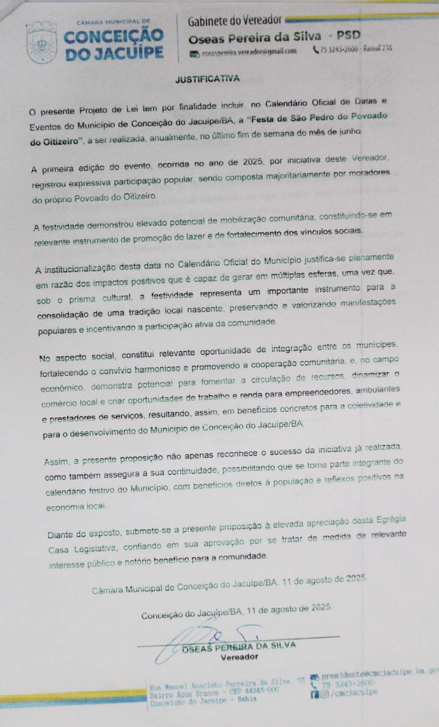 Ainda na mesma sessão, foi aprovado o Projeto de Lei de autoria do Vereador Oseas que institui oficialmente a Festa de São Pedro do Oitizeiro no calendário cultural do município, fortalecendo a tradição local e garantindo reconhecimento oficial ao evento.