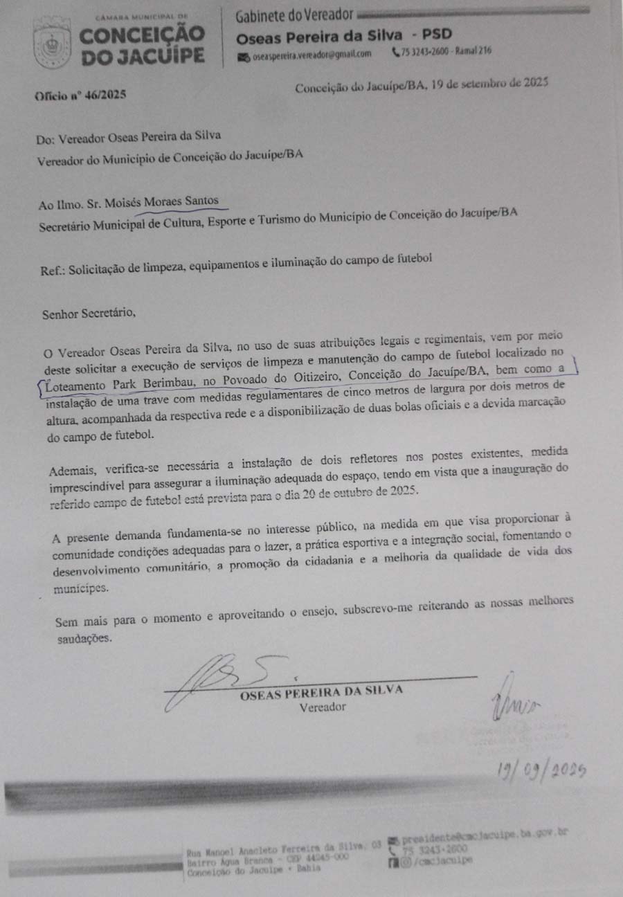 Na sessão da Câmara de Conceição do Jacuípe desta quarta-feira, 24 de setembro de 2025, o Vereador Oseas apresentou ofícios solicitando que o campo de futebol do Oitizeiro seja preparado para inauguração no dia 20 de outubro, data em que o município comemora seu aniversário.