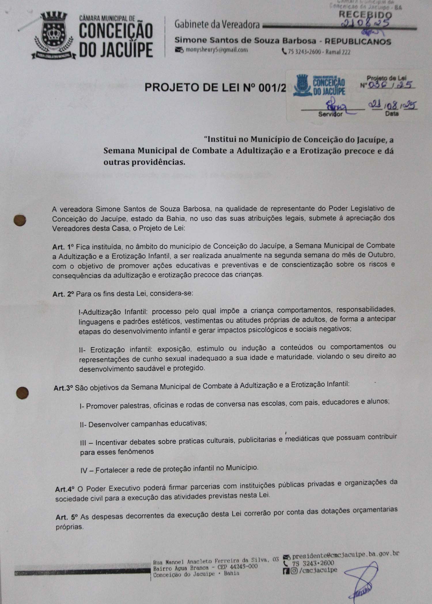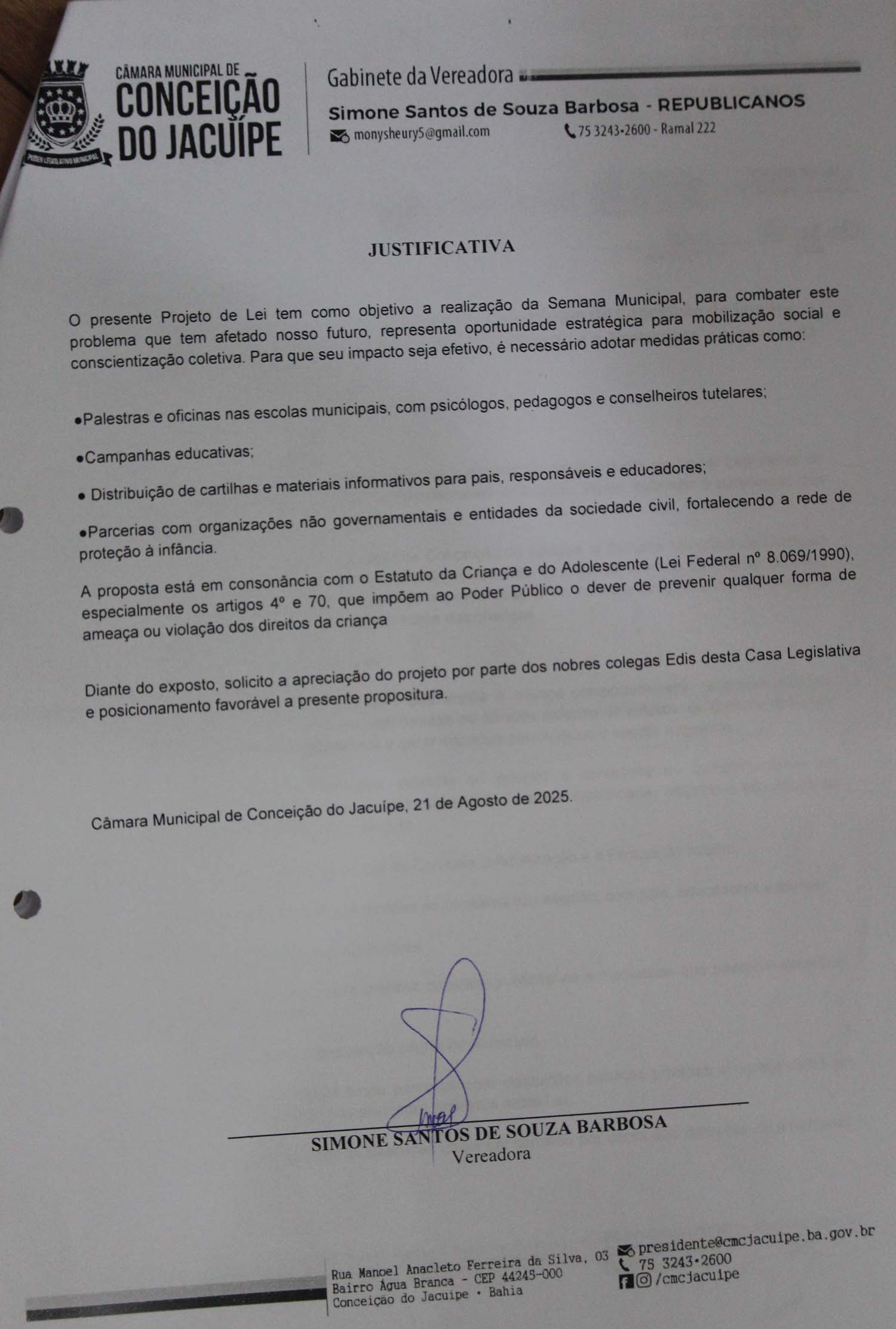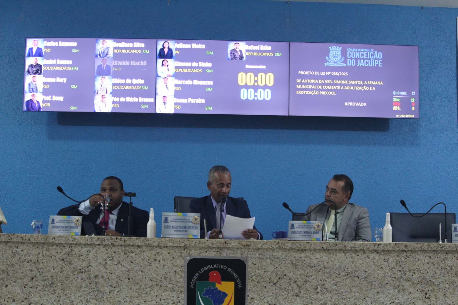 Na sessão desta quarta-feira, 24 de setembro de 2025, a Câmara Municipal de Conceição do Jacuípe aprovou por unanimidade dos vereadores presentes o primeiro Projeto de Lei da vereadora Simone, que trata do combate à adultização e à sexualização de crianças.