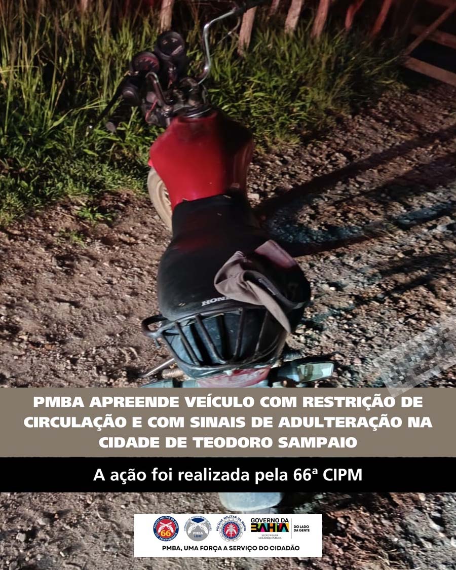 Na noite desta quarta-feira, 02 de abril de 2026, policiais militares da 66ª CIPM realizaram a apreensão de uma motocicleta com restrição de circulação (sucata) e com sinais claros de adulteração, na zona rural de Teodoro Sampaio.