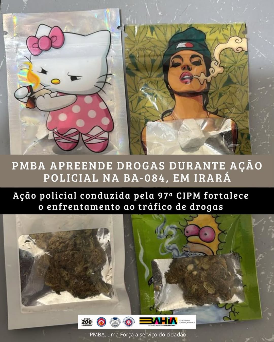 Durante uma ação policial realizada na BA-084, no trecho após o ponto da Caboronga, no município de Irará, uma guarnição da 97ª CIPM apreendeu substâncias análogas a entorpecentes.