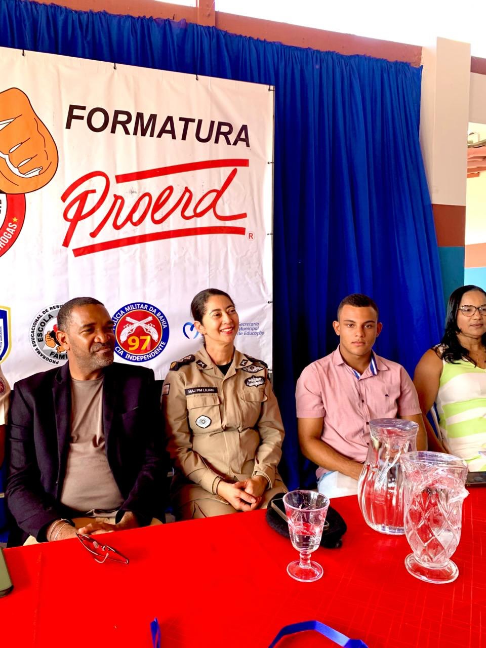 A cerimônia de encerramento contou com a presença da Comandante da OPM, a Maj PM Lilian, o Ten PM Ladson, comandante do 3º Pel, o instrutor do PROERD, SGT PM Macedo, Secretário de Educação, Prof Joelson Silva, a equipe escolar, familiares e demais autoridades.