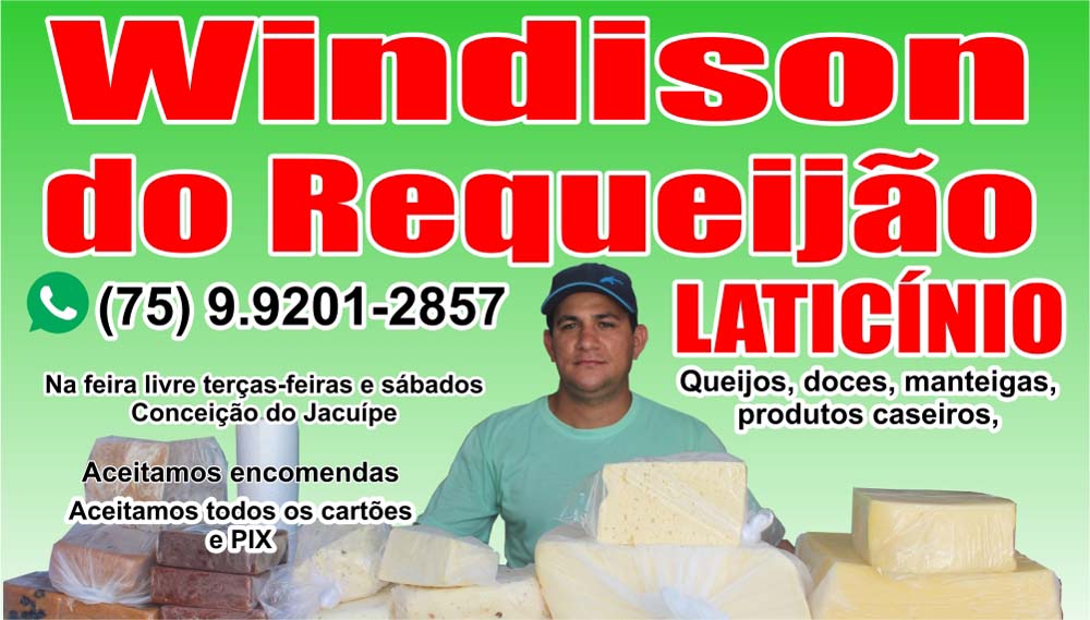Toda terça-feira e sábado, na feira livre de Conceição do Jacuípe (Berimbau), você encontra os melhores produtos da região com Windison do Requeijão!