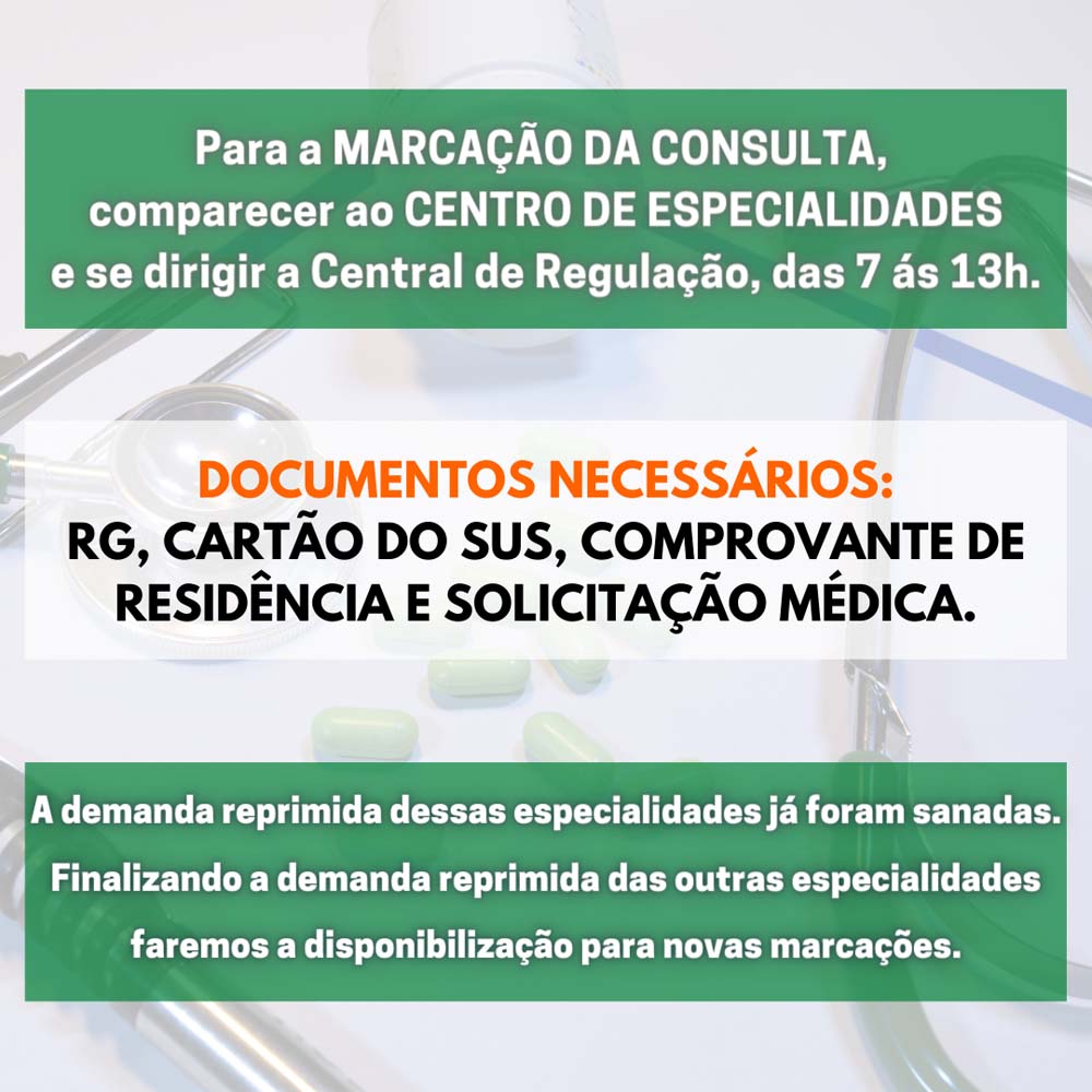 Para a marcação da consulta, os pacientes deverão comparecer ao Centro de Especialidades e se dirigir à Central de Regulação, das 7h às 13h, munidos de RG, Cartão do SUS, Comprovante de Residência e da solicitação médica.