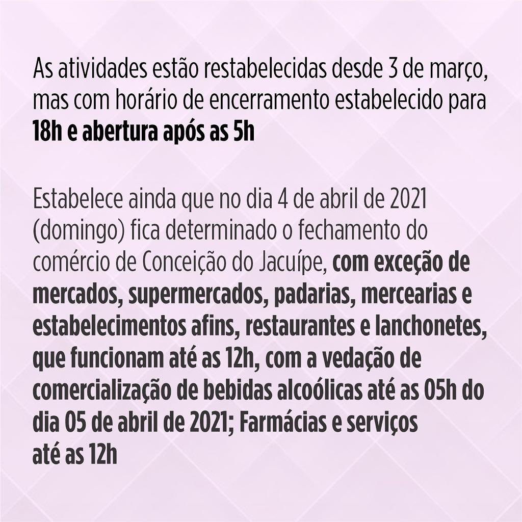 A Prefeitura de Conceição do Jacuípe publicou novo decreto nesta quinta-feira (dia 1º), de número 253/2021 - alterando determinações divulgadas no decreto 252, o qual estabelece que no dia 4 de abril (domingo) fica determinado o fechamento do comércio de Conceição do Jacuípe, com exceção de mercados, supermercados, padarias, mercearias e estabelecimentos afins, restaurantes e lanchonetes, que funcionam até às 12h, com a vedação de comercialização de bebidas alcoólicas até as 05h do dia 05 de abril de 2021. As farmácias e serviços também só vão poder funcionar até às 12h.