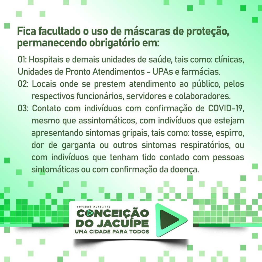 A Prefeitura de Conceição do Jacuípe divulgou nesta terça-feira 13/04, o Decreto 122/2022 com as medidas, regras e protocolo sanitário em vigor para o enfrentamento da Pandemia da COVID-19, no âmbito do município de Conceição do Jacuípe.