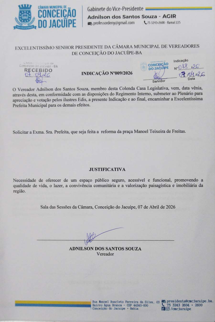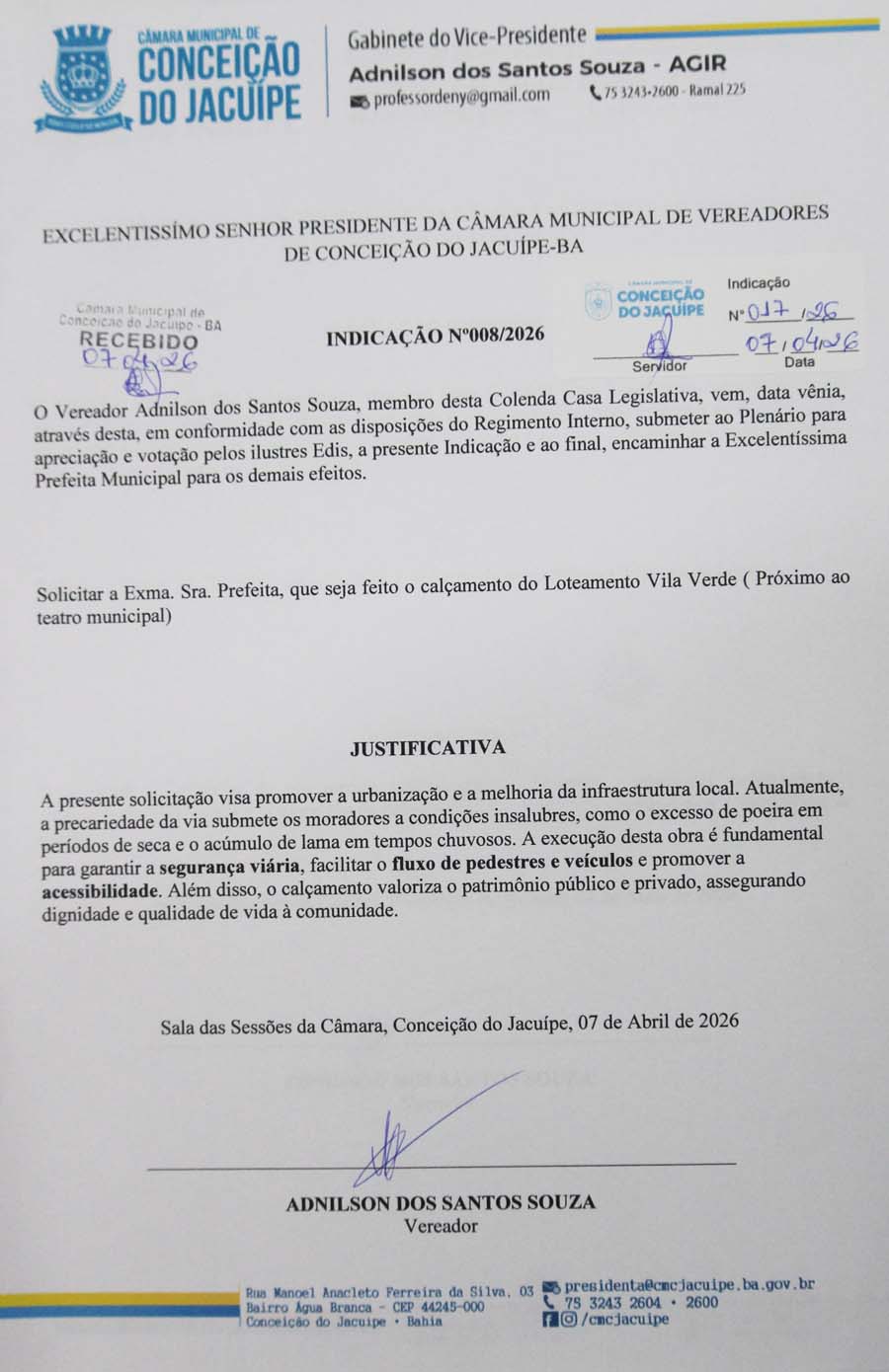 Na sessão da Câmara de Conceição do Jacuípe, desta quarta-feira, 08 de abril de 2026, o vereador Professor Deny utilizou a tribuna para abordar temas sociais, demandas estruturais e apresentar novas indicações ao Executivo.