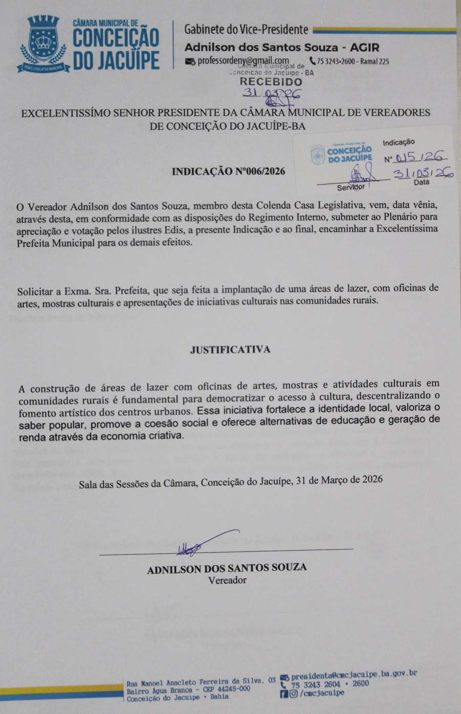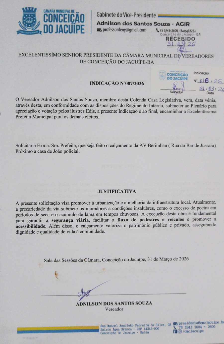O vereador Professor Deny solicitou o calçamento da Avenida Berimbau e a criação de uma área de lazer na zona rural de Conceição do Jacuípe, visando melhorias na infraestrutura e na qualidade de vida da população.