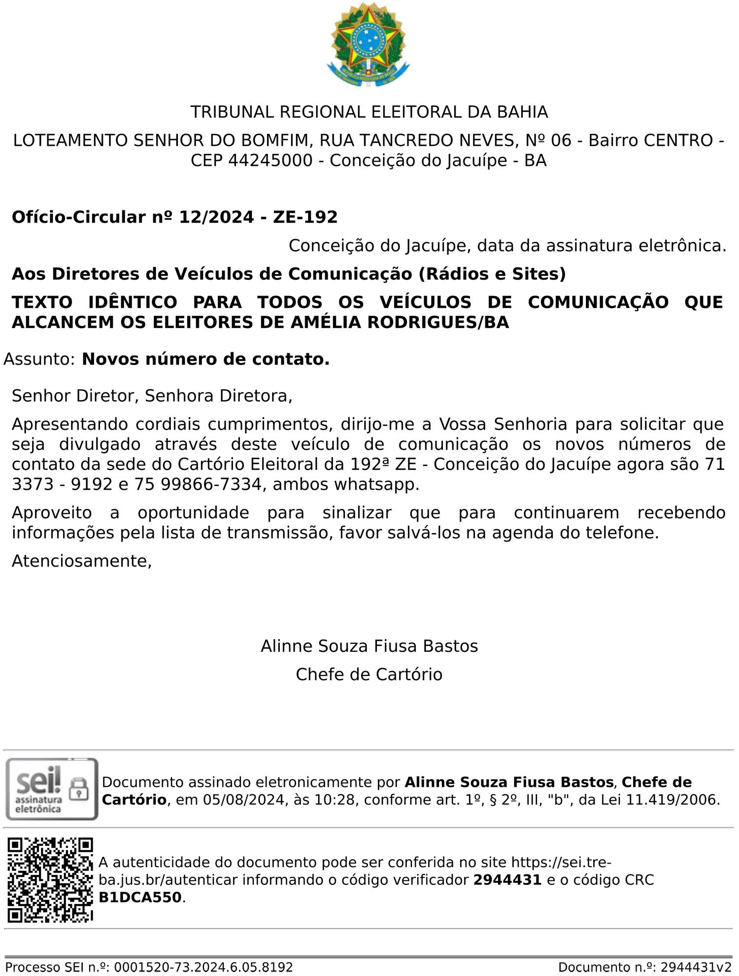 Os contatos da sede do Cartório Eleitoral da 192ª ZE - Conceição do Jacuípe agora são 71 3373 - 9192 e 75 99866-7334, ambos Whatsapp.
