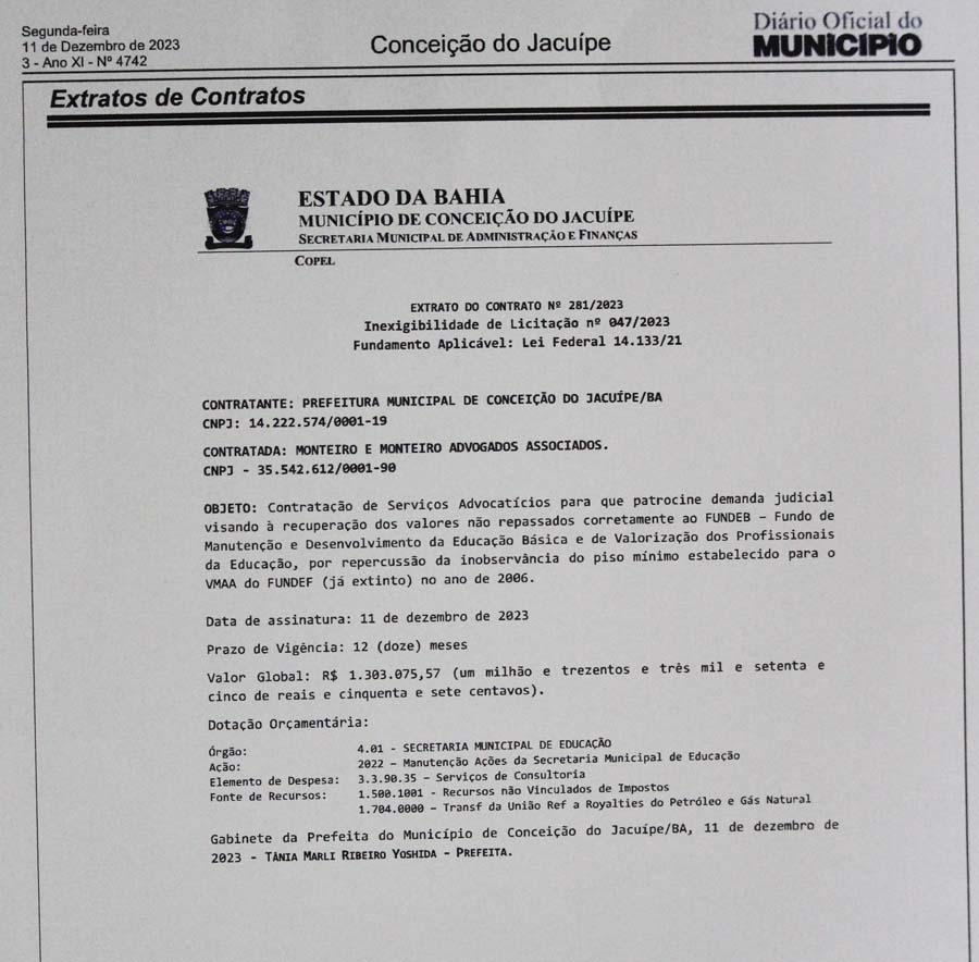 Na sessão desta quarta-feira, 13 de dezembro de 2023, o tema de um contrato feito pela prefeitura de Conceição do Jacuípe de mais de 1 milhão de reais a uma consultoria despertou o comentário dos vereadores, sendo que Jodilson Cerqueira afirmou que a prefeitura fala muito de milhões, só quando fala em salário que o tema são tostões.