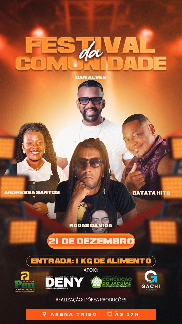 A comunidade da Tribo, em Conceição do Jacuípe (Berimbau), será palco neste domingo, 21 de dezembro de 2025, do Festival da Tribo, Festival da Comunidade, um grande evento que une esporte, cultura, lazer e solidariedade. A programação é gratuita e aberta a toda a população do município.