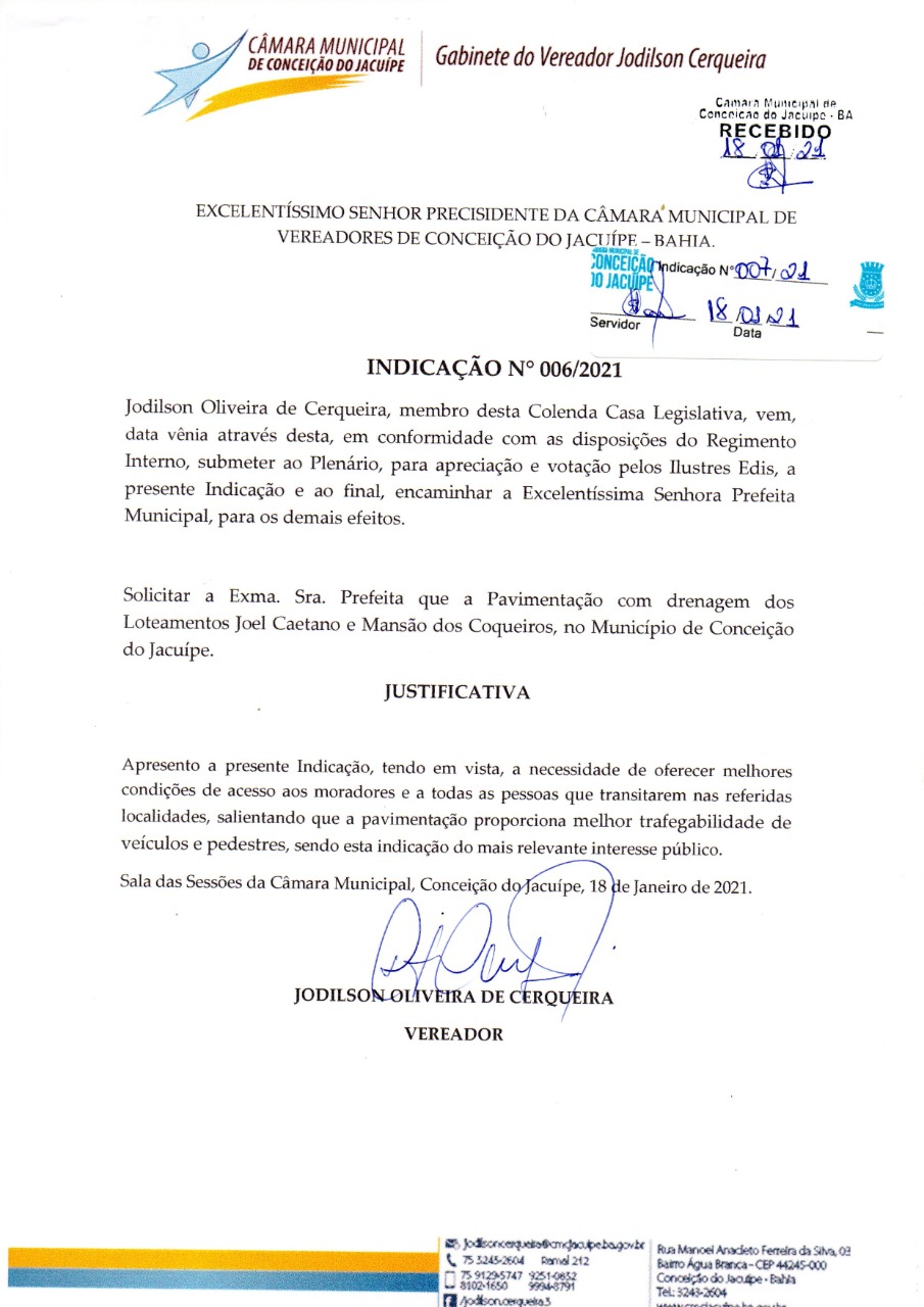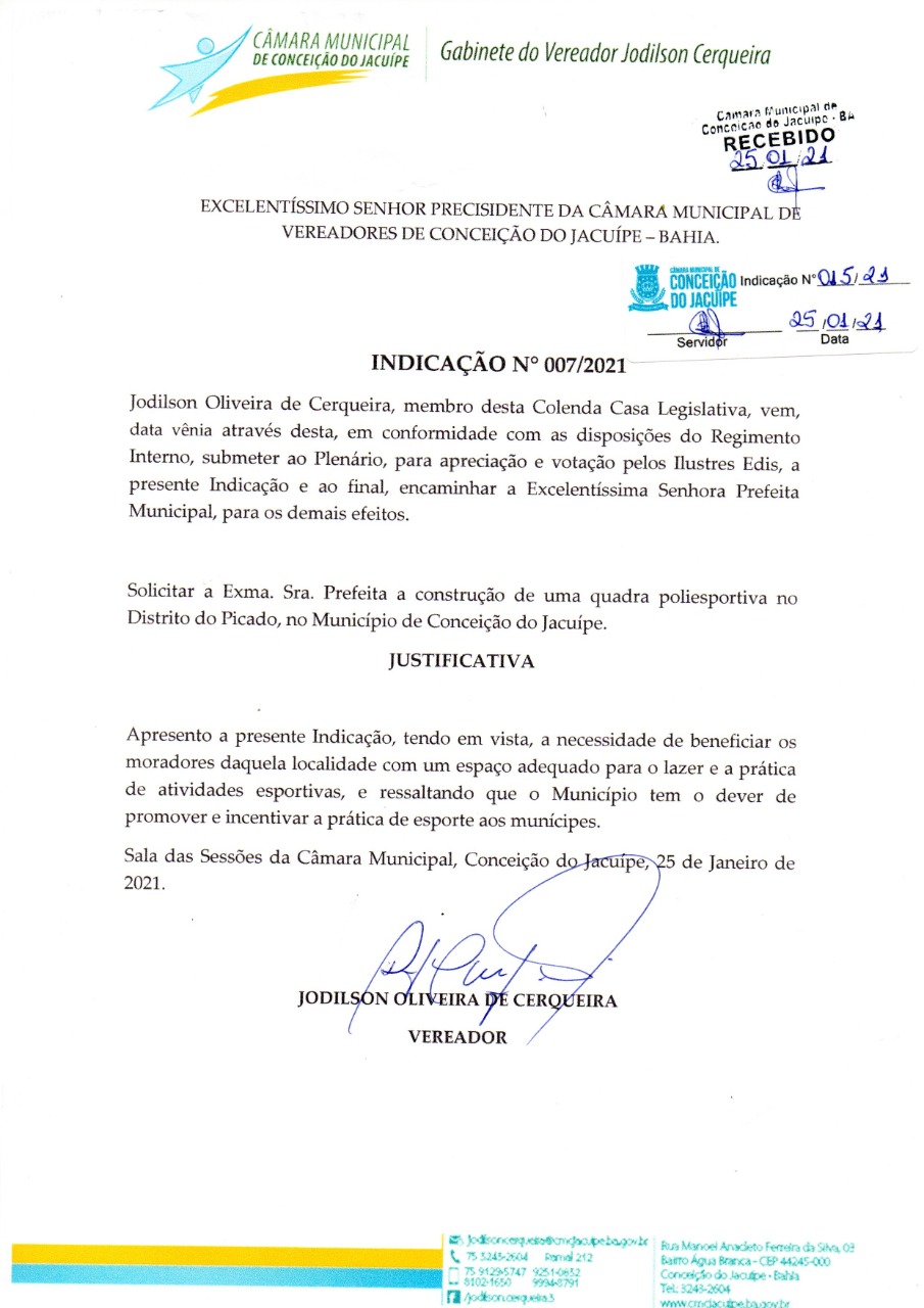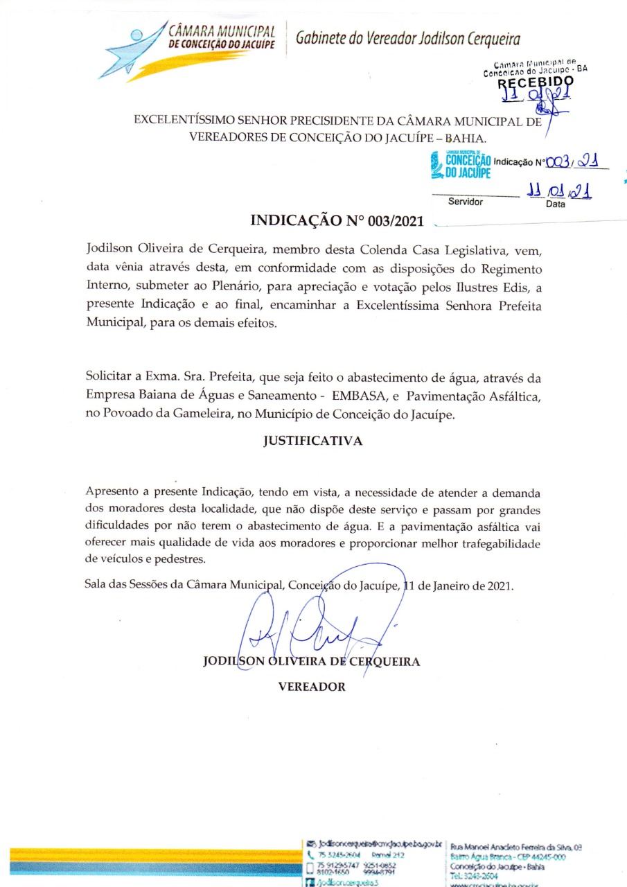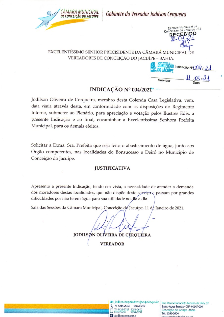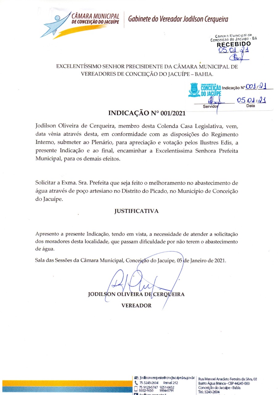 Dentro das indicações do Vereador Jodilson Cerqueira estão o pedido de poço artesiano no Picado, o 14º para agentes comunitários, pavimentações asfalticas e etc.