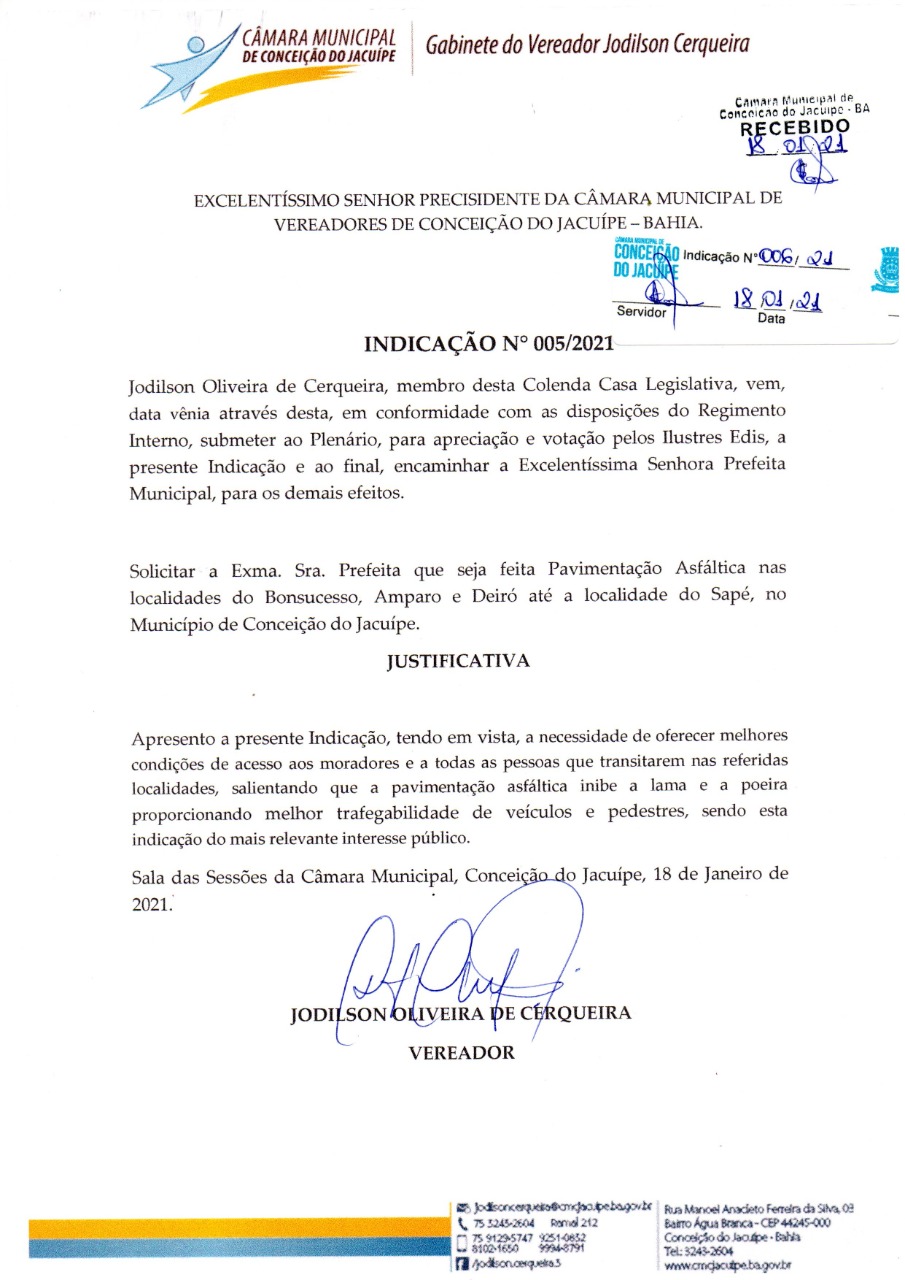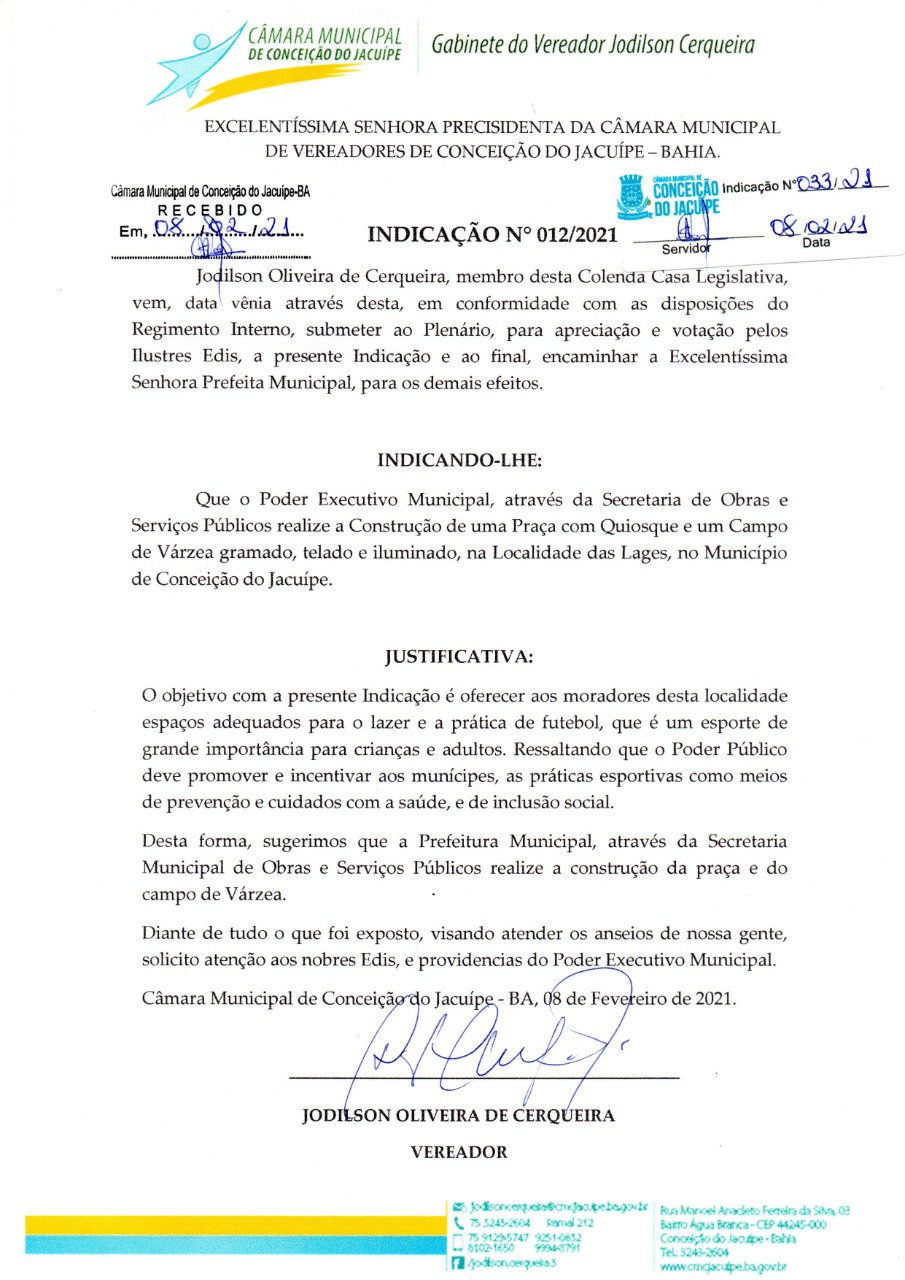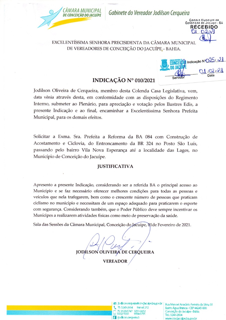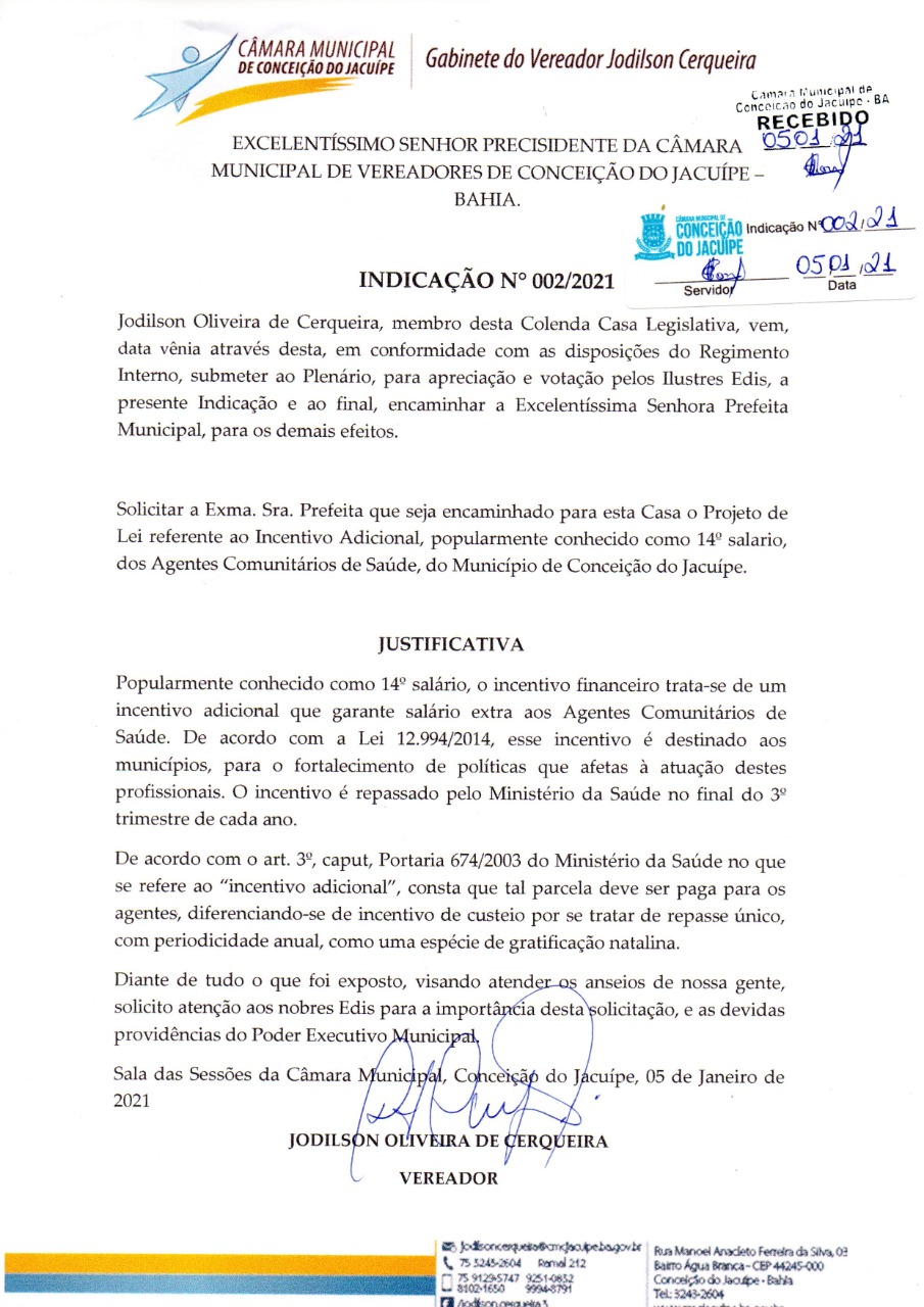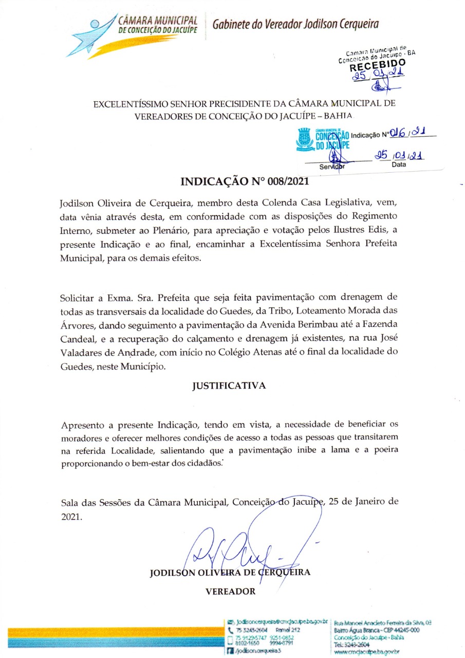 Dentro das indicações do Vereador Jodilson Cerqueira estão o pedido de poço artesiano no Picado, o 14º para agentes comunitários, pavimentações asfalticas e etc.