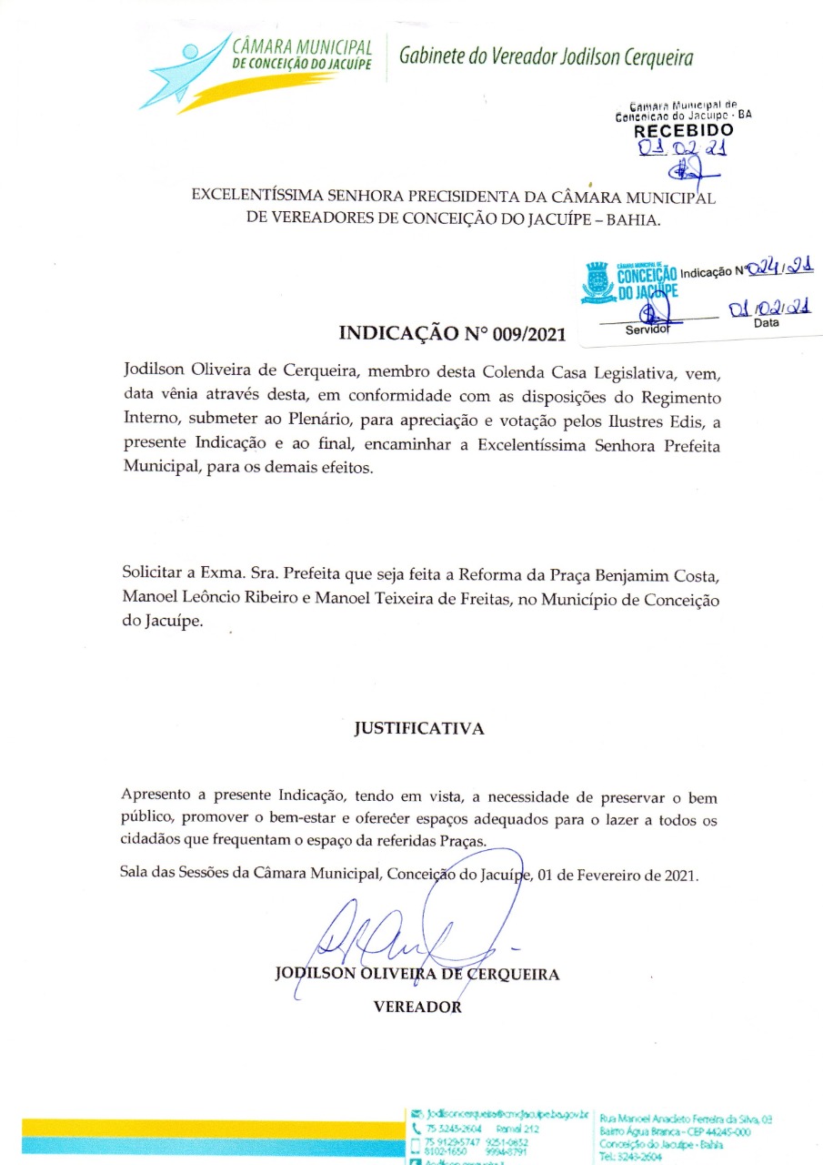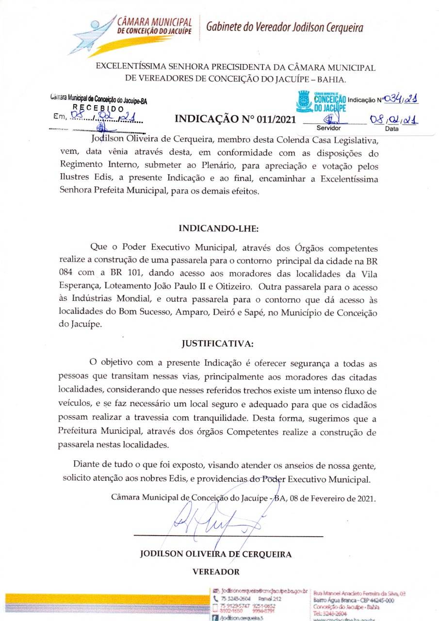 Na sessão foram apresentados três projetos de Lei advindo do Executivo, e apresentadas mais de 40 indicações dos vereadores, das quais, 12, foram de autoria do Vereador Jodilson Cerqueira, perfazendo, praticamente ¼ das indicações dos 13 vereadores.