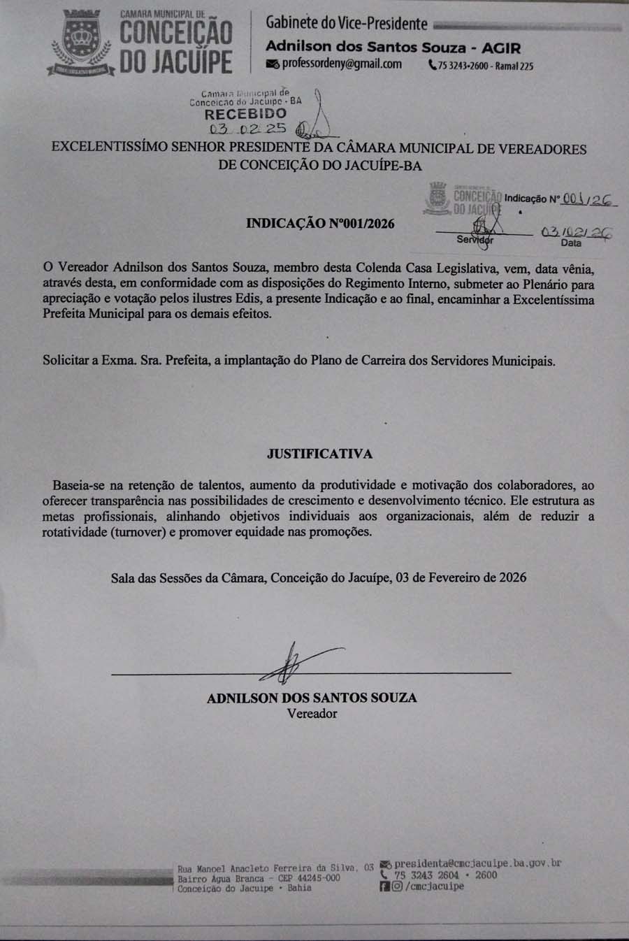 Na sessão de abertura dos trabalhos legislativos da Câmara Municipal de Conceição do Jacuípe, realizada no dia 04 de fevereiro de 2026, o vereador Professor Deny utilizou a sua fala para apresentar indicação e destacar pautas voltadas aos servidores públicos e aos estudantes do município.