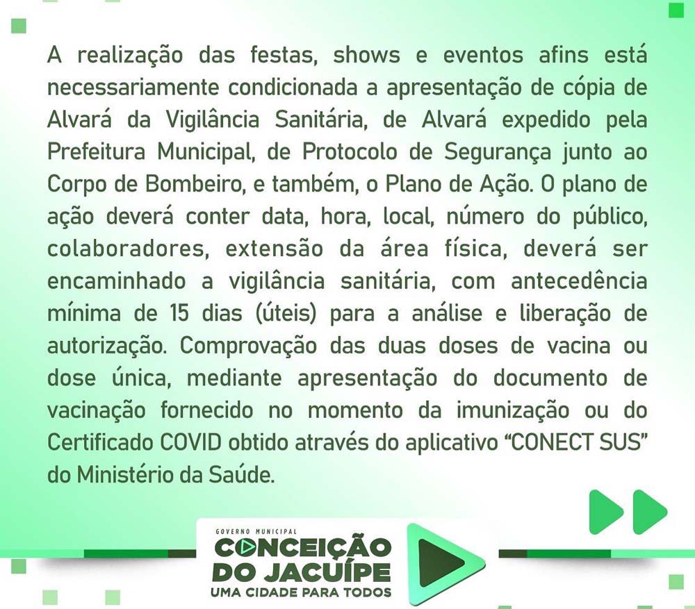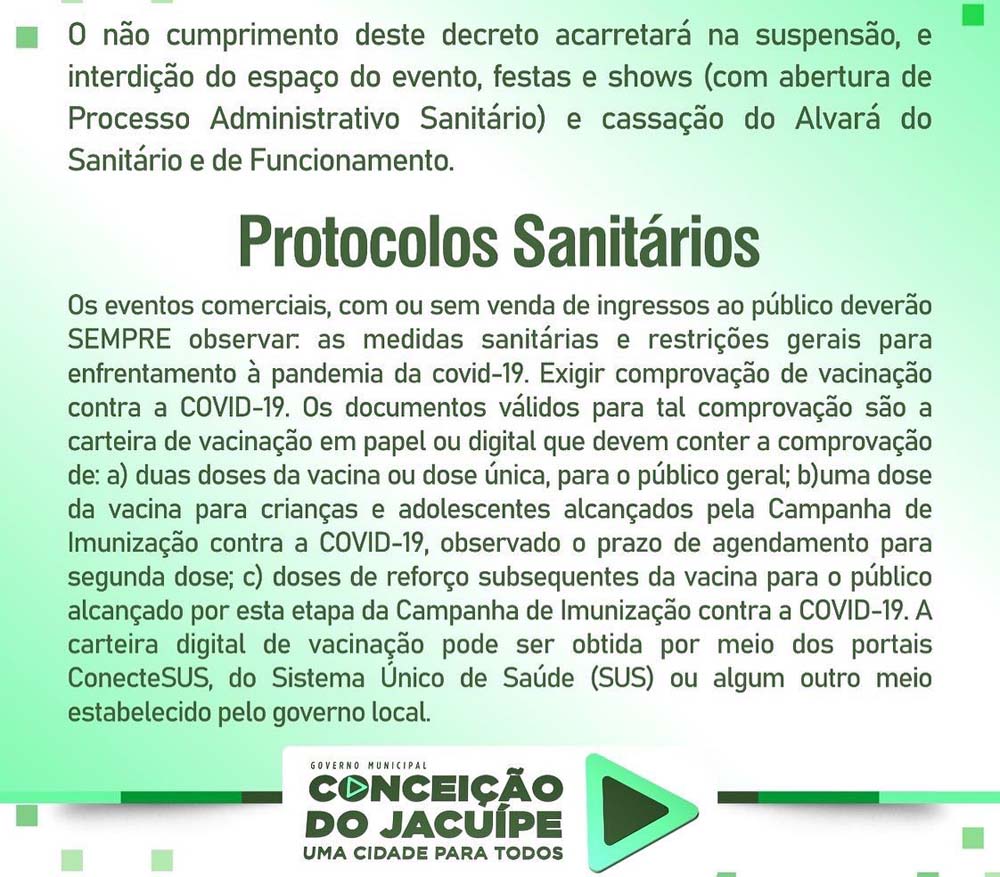 A Prefeitura de Conceição do Jacuípe, através da Secretaria de Saúde e da Vigilância Sanitária Municipal, divulgaram nesta quinta-feira 27 de janeiro, o Decreto de número 017/2022 com as novas regras e protocolos sanitários para o enfrentamento da Pandemia da COVID-19 no âmbito do município de Conceição do Jacuípe. Dentre as medidas estão a autorização para a realização de eventos, festas e shows urbanos e rurais, em logradouros públicos ou privados tais como casa de shows, clube social, casa de festa, bares, restaurantes e similares, com a presença de público de até 1.500 (um mil e quinhentas) pessoas, no período entre os dias 11 de janeiro a 04 de fevereiro. Para a realização dos eventos, deverão ser tomadas precauções como a ocupação de, no máximo, 50% da área interna do espaço, distanciamento de 1,5m entre as pessoas presentes, uso de máscara, material de higiene para as mãos e apresentação da comprovação de vacinação contra a COVID-19 com no mínimo de duas doses da vacina. O Decreto estabelece regras de limpeza, adequação do espaço, divulgação, instalações sanitárias e de informação aos participantes dos eventos realizados no âmbito de Conceição do Jacuípe. Para ter acesso ao protocolo completo, e saber todas as normas para a realização de eventos e as normas sanitárias estabelecidas no Decreto 017/2022, acesse:
