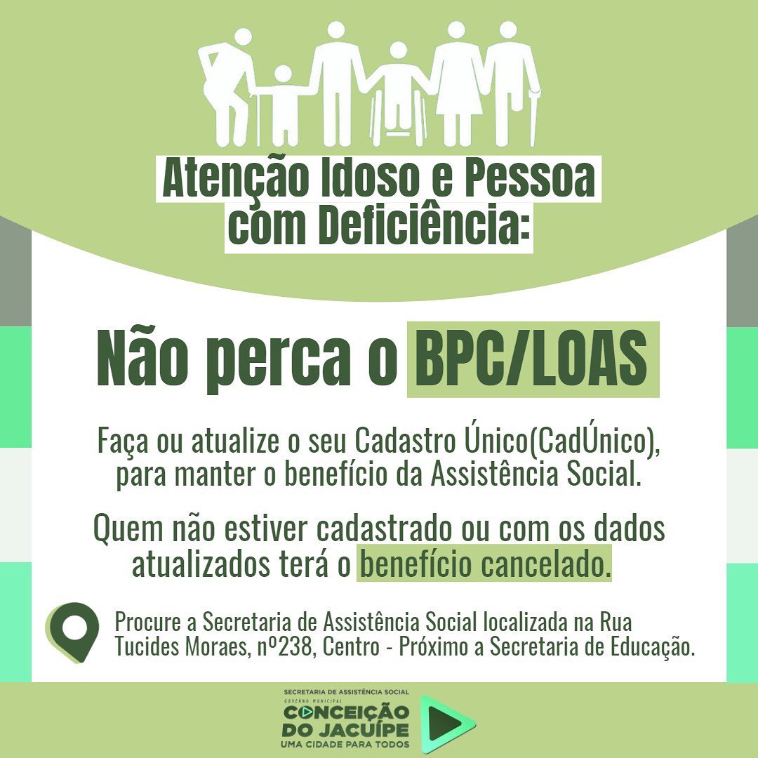 A Prefeitura de Conceição do Jacuípe, através da Secretaria de Assistência Social, chama a atenção dos Idosos e pessoas com deficiência, beneficiários dos Benefícios de Prestação Continuada (BPC) e Lei Orgânica Da Assistência Social (LOAS) para que façam ou atualizem o Cadastro Único (CADUNICO).