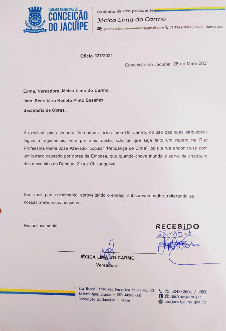 A Vereadora Jécica de Cacau do Boi, atenta as necessidades do município, enviou oficio as secretaria de obras solicitando a restauração do calçamento da Rua Profª Maria José Azevedo, a “Pendanga de Cima”.