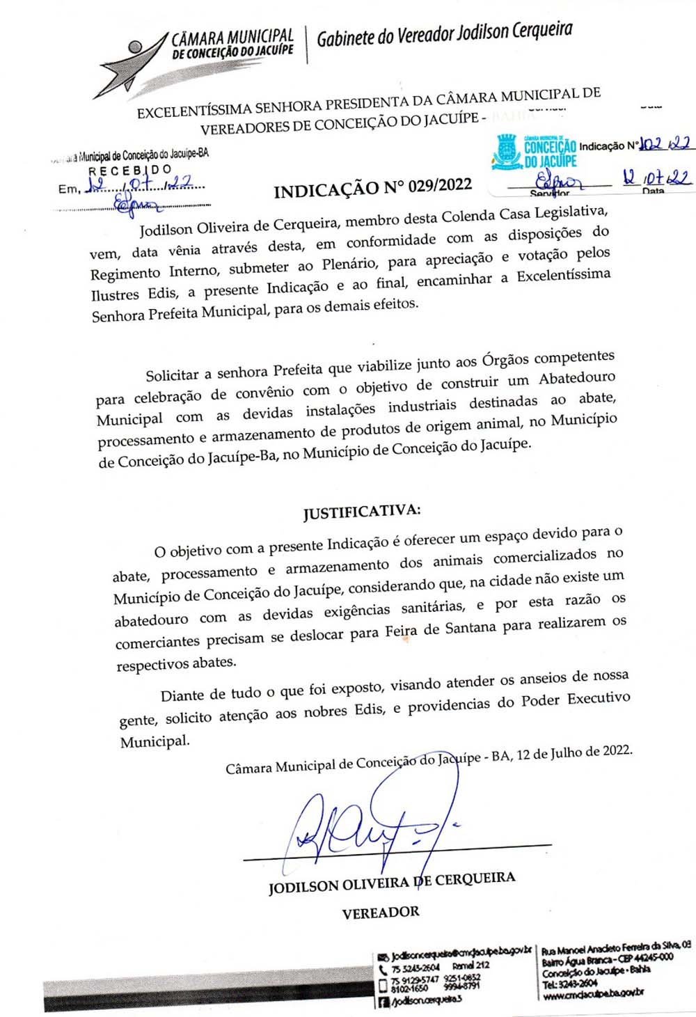 Na sessão desta quarta-feira, 13 de julho de 2022, o Vereador Jodilson Cerqueira entrou com indicação solicitando que a prefeitura crie um abatedouro para o município de Conceição do Jacuípe.