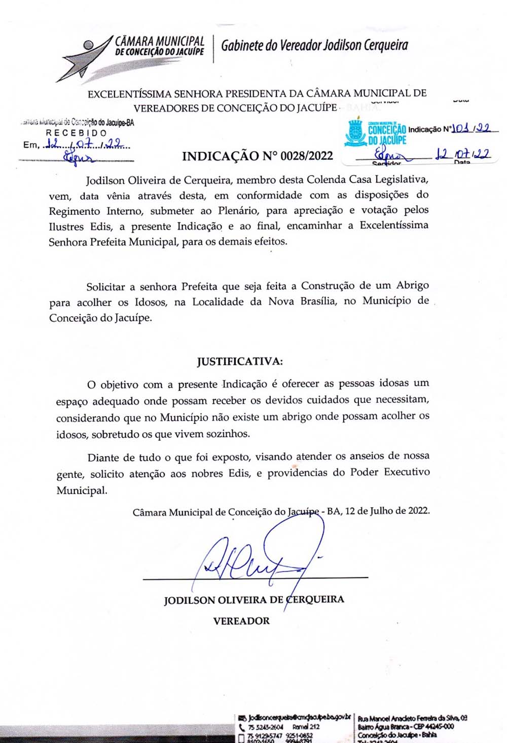 Foi feita também uma indicação solicitando a construção de um abrigo para idosos na localidade de Nova Brasília em Conceição do Jacuípe.