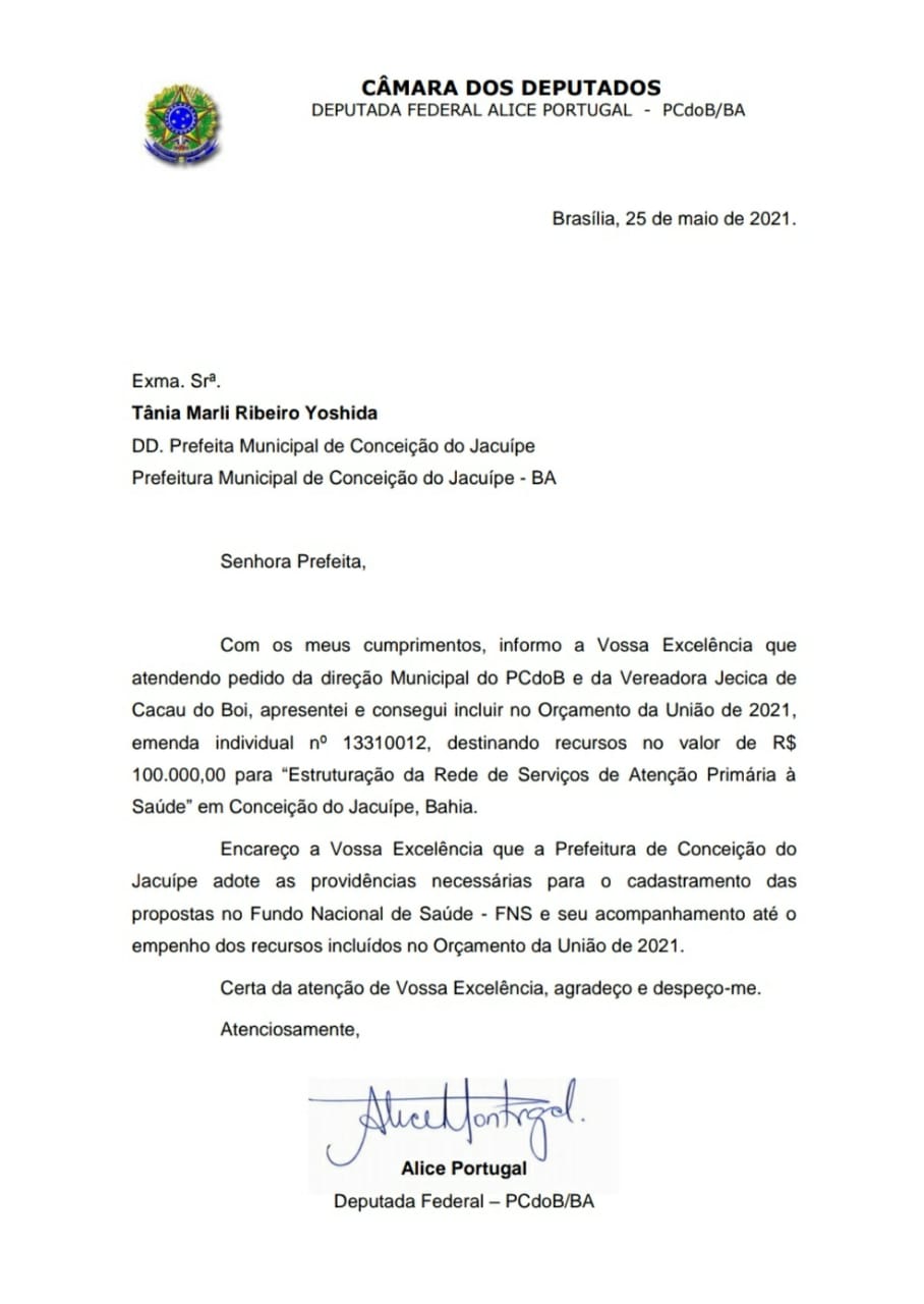 Nesta segunda-feira, 21 de junho de 2021, a Vereadora de Conceição do Jacuípe, Jécica de Cacau do Boi, esteve no gabinete da deputada Alice Portugal, onde foi anunciado que através do seu pedido o município recebeu uma emenda no valor de 100mil para ser aplicado na saúde.
