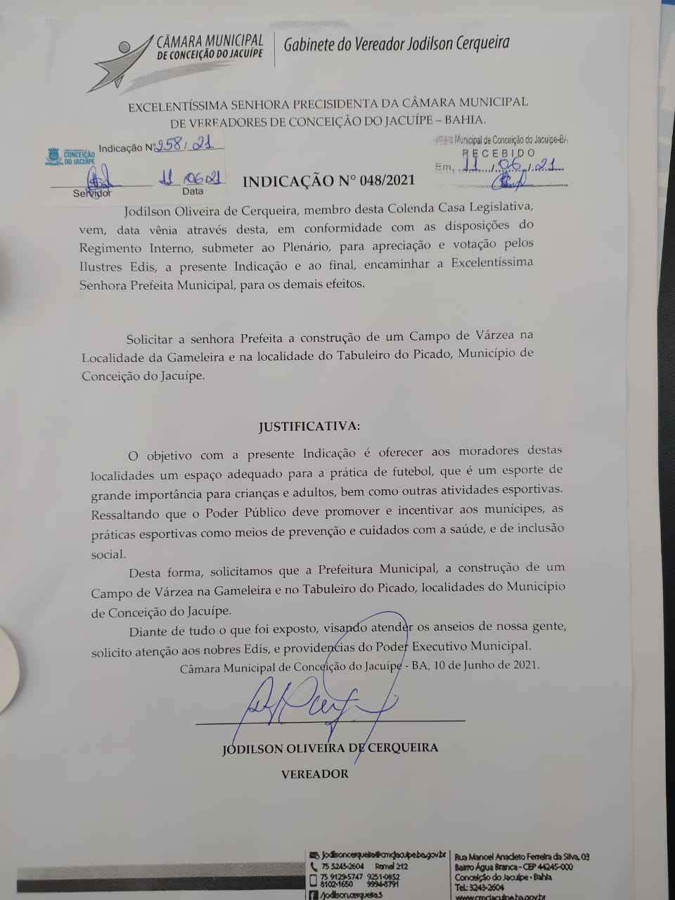 Em outra indicação o Vereador Jodilson Cerqueira solicitou a construção de campos de várzea na Gameleira e no Picado, dando condições melhores da pratica esportiva nestes locais.