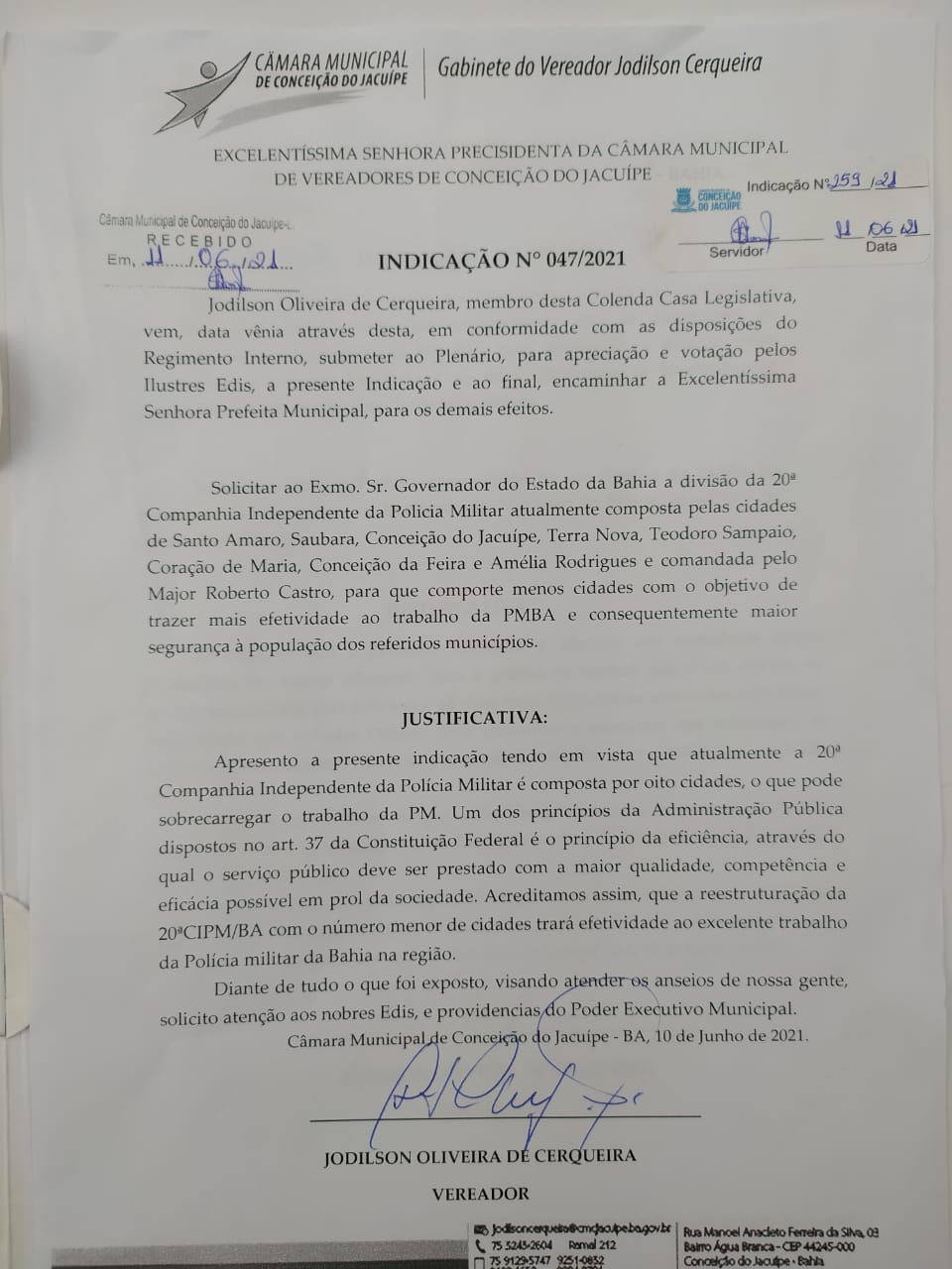 Na sessão desta quarta-feira, 16 de junho de 2021, o Vereador Jodilson Cerqueira entrou com uma indicação solicitando que a 20ª CIPM seja particionada para que o policiamento seja mais efetivo na região.