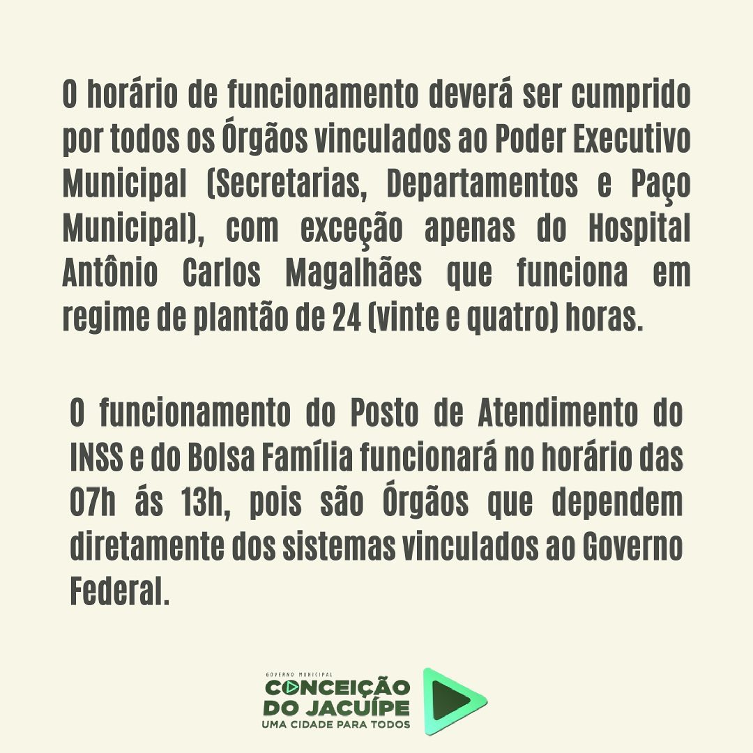 O horário de funcionamento deverá ser cumprido por todos os Órgãos vinculados ao Poder Executivo Municipal (Secretarias, Departamentos e Paço Municipal), com exceção apenas do Hospital Antônio Carlos Magalhães que funciona em regime de plantão de 24 (vinte e quatro) horas.