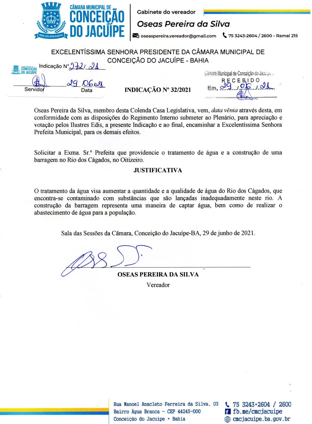 O Rio dos Cagados no Oitizeiro é uma importante fonte de água para os agricultores da localidade e é importante se manter este manancial que corre muito risco com a poluição por esgoto de casas. Na sessão desta quarta-feira, 30 de junho de 2021, o Vereador Oseas entrou com uma indicação solicitando que a prefeitura de Conceição do Jacuípe providencie a construção de uma barragem no Rio dos Cagados e o tratamento das águas deste rio que beneficia muito os moradores e produtores da região, porém vem sofrendo com o despejo do esgoto da localidade Vila Esperança, com o tratamento deficitário deste esgoto feito pela Embasa. (click aqui e aqui)