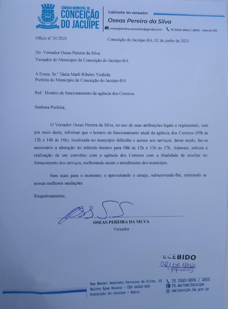 Na sessão desta quarta-feira, 02 de junho de 2021, o Vereador Oseas relatou que enviou um oficio a prefeita, solicitando que ela acione o Correios da cidade para que este melhore seu atendimento.