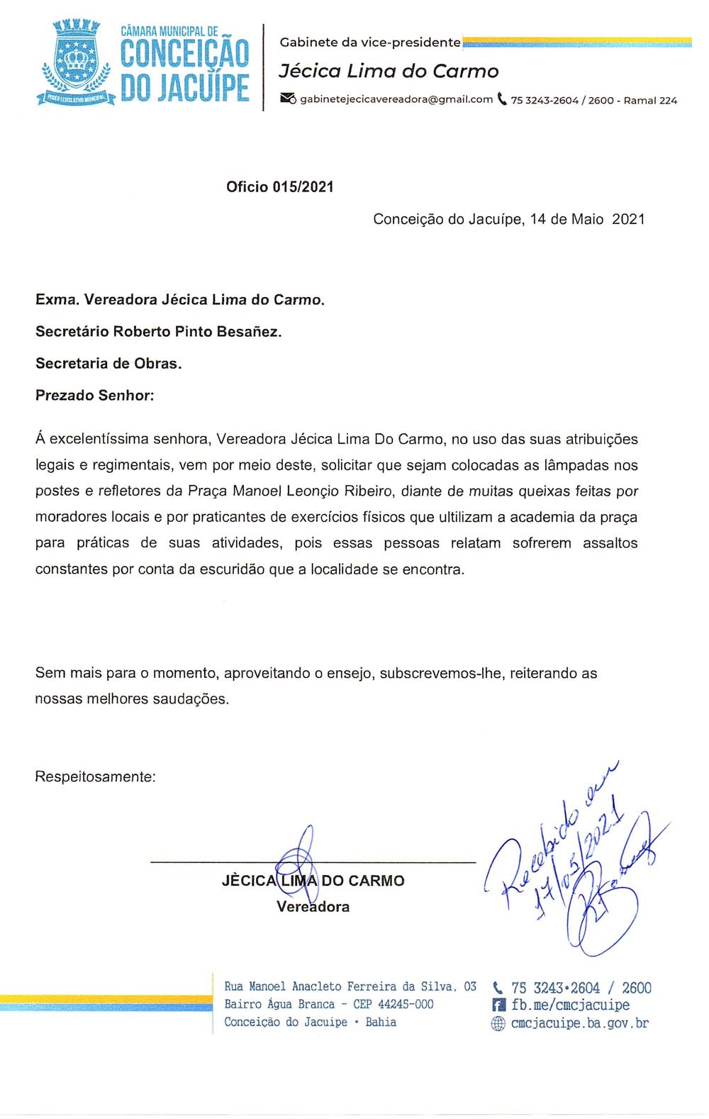 Seguindo sua função de Vereadora, Jécica de Cacau do Boi, confirmando as necessidades, enviou um oficio ao Secretário de Obras do município, que em tempo hábil fez os reparos nas luminárias, tornando a Praça mais segura e cômoda aos moradores e transeuntes.