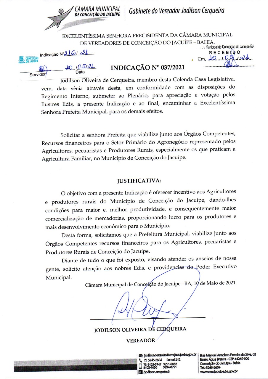 Na sessão desta quarta-feira, 12 de maio de 2021, o vereador Jodilson Cerqueira entrou com indicação solicitando que o Executivo do município viabilize, junto aos setores competentes os recursos financeiros para o setor do agronegócio de Conceição do Jacuípe, representados pelos pecuaristas, agricultores familiares e etc.